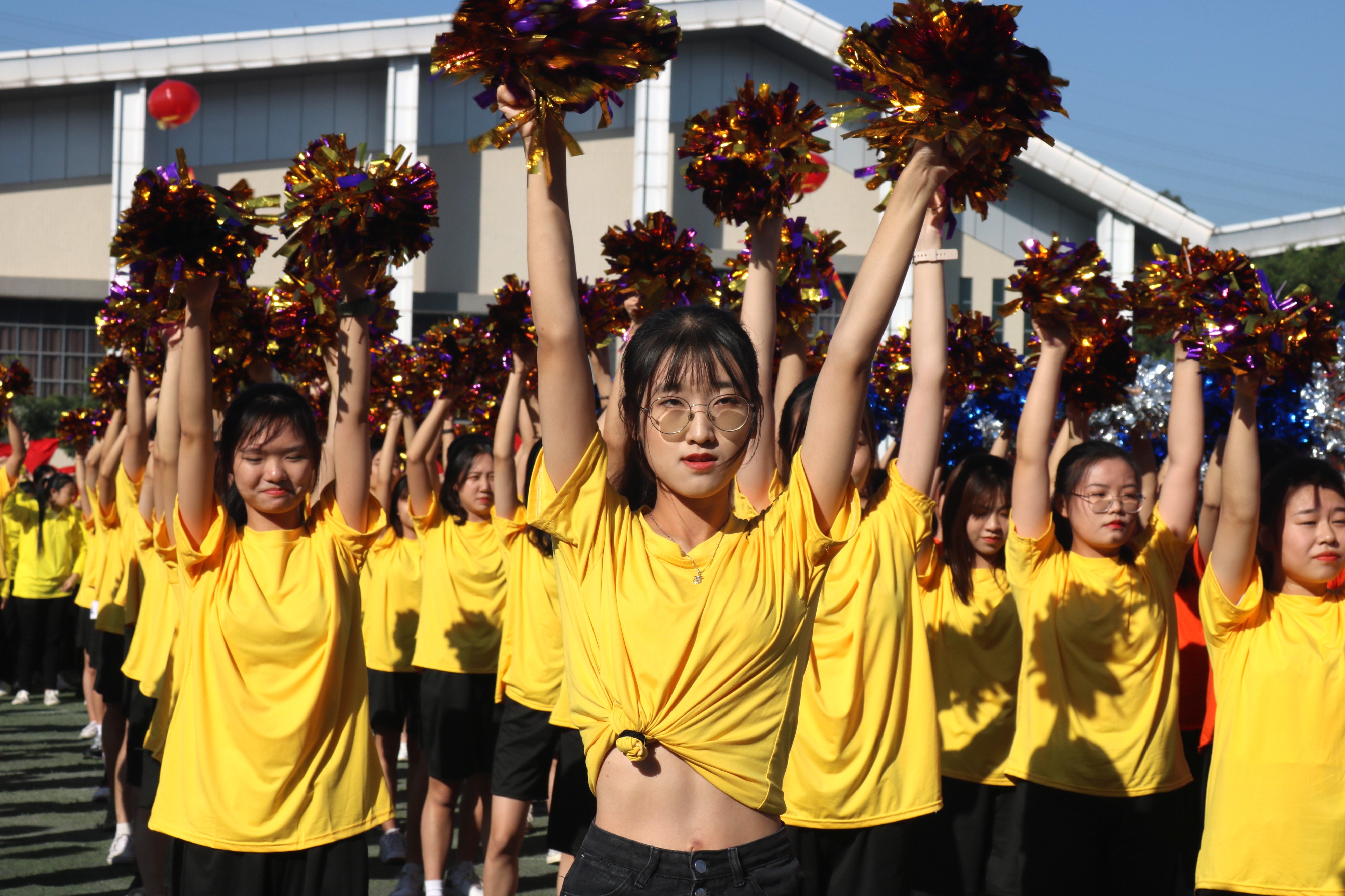 最后,各个学院的学生队伍在田径场为开幕式表演团体操,团体操以“穿越风雨,同心抗疫”“强身健体,快乐同行”“凝心聚力,再创辉煌”三个主题展示。学生队伍身穿靓丽的衣着、手拿耀眼的啦啦球,青春洋溢的面容与活力的动作,彰显了城院学子朝气蓬勃的姿态。团体操表演以其多变的形式、优美的旋律而使整个会场变得赏心悦目。