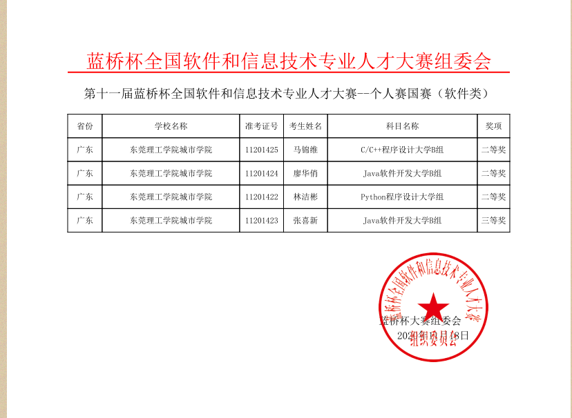 11月17日,由工业和信息化部人才交流中心主办的第十一届蓝桥杯全国软件和信息技术专业人才大赛(个人赛)全国总决赛圆满结束。beat365计算机与信息学院学子斩获二等奖3项,三等奖1项,在广东省同类院校位列第一。