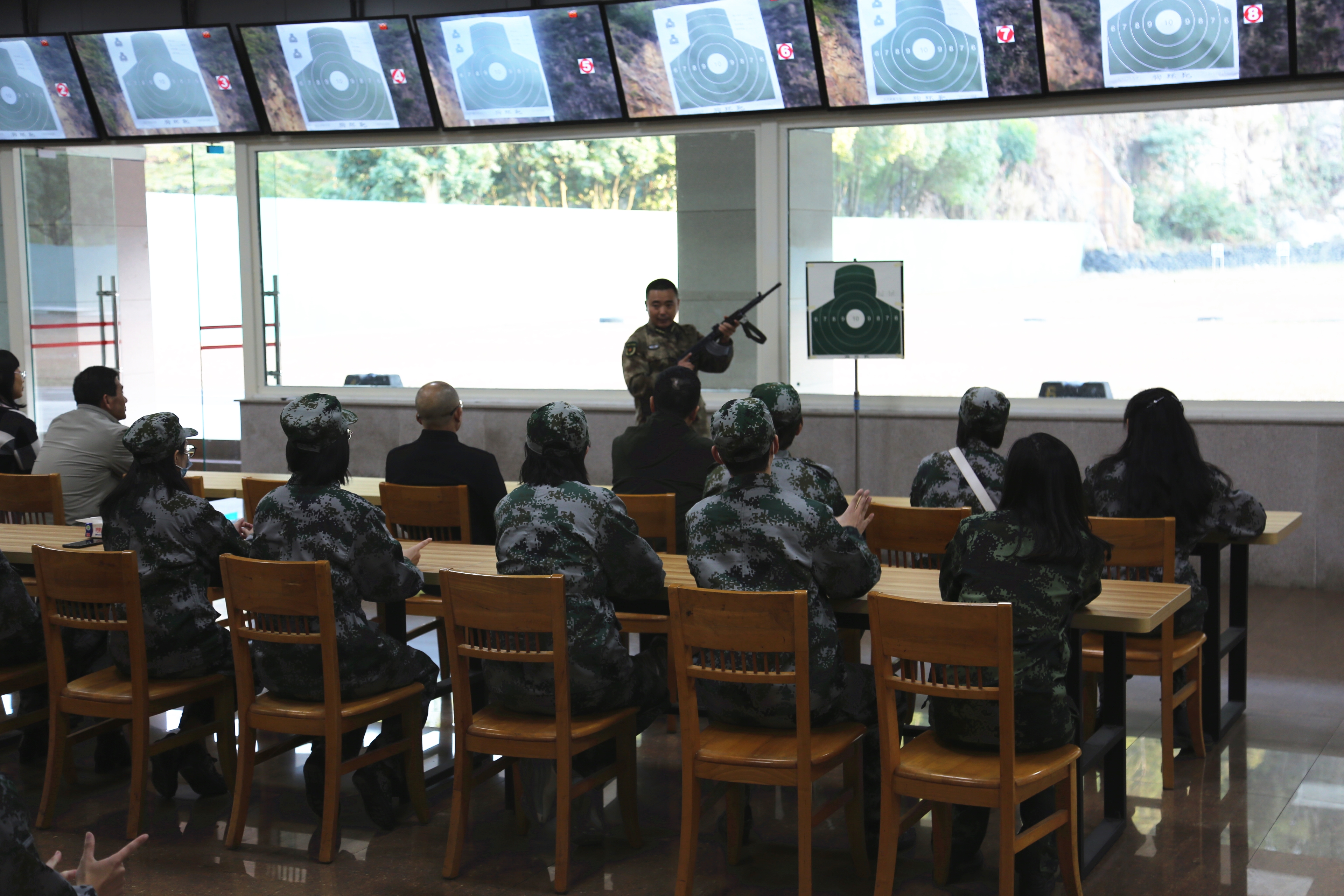 在国防教育训练基地,彭部长带领大家参观基地展厅,介绍了常用的武器知识。在射击场地,彭部长结合武器装备向beat365军训团成员详细讲解了枪支特点、射击方法、射击操作要领和注意事项,并组织大家学习、体验实弹射击。