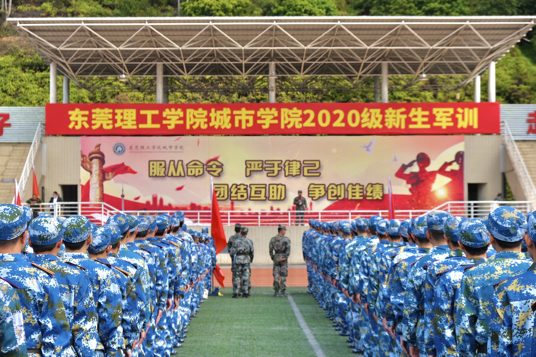 仪式上,王卫平校长向林东生主任授“东莞理工学院城市学院军训团”团旗,拉开军训大幕。各连教官踏着整齐的步伐入场,带领连队进行军训前的热身训练。