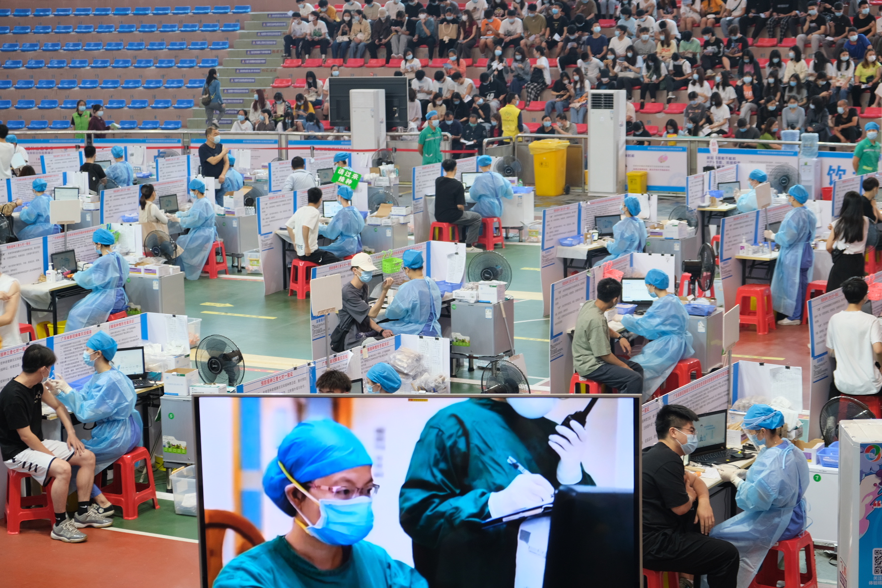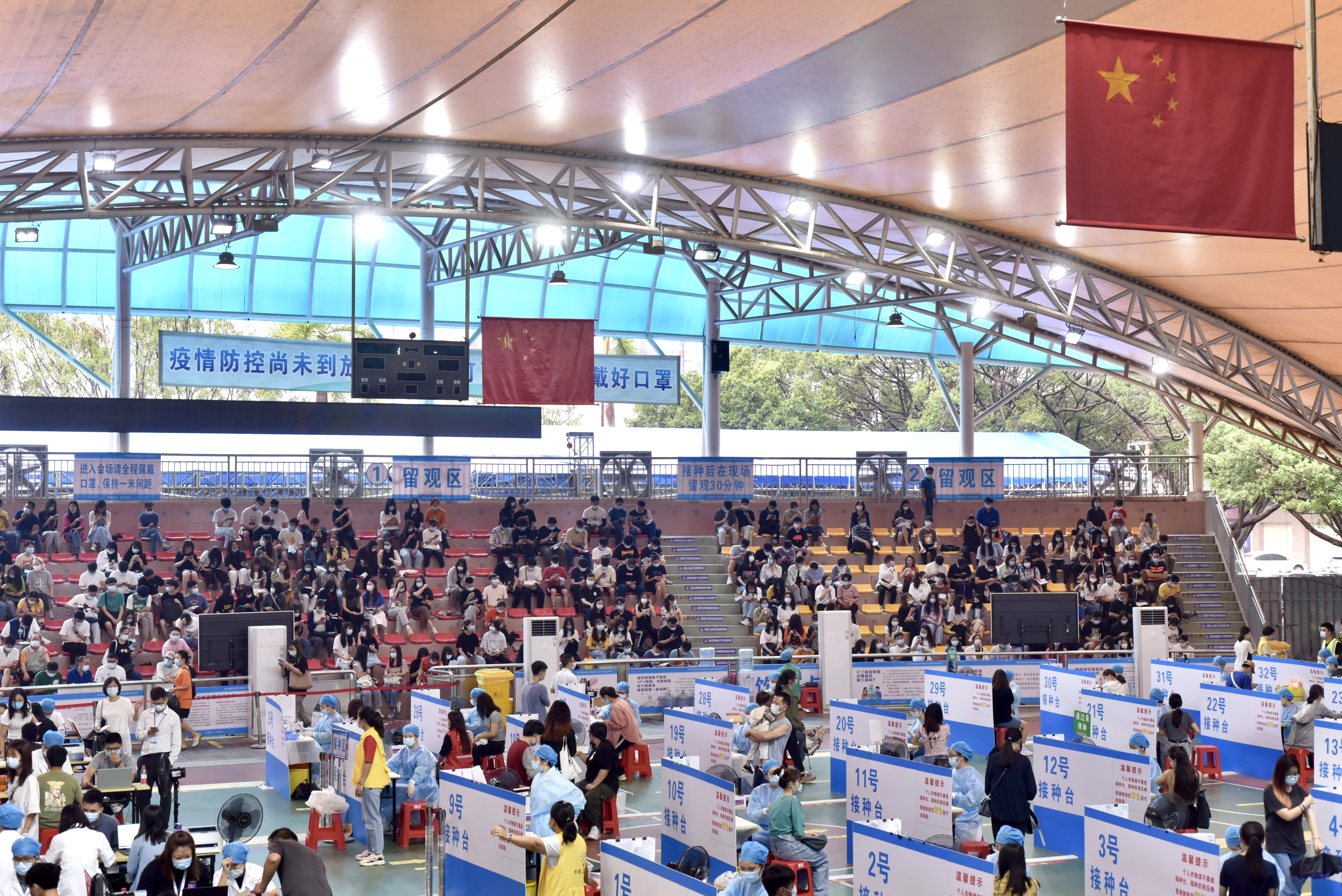 教务处做好调课安排,学生处安排全校的学生按学院情况分批次按流程进行接种,人事处安排无课的老师前往。最大限度在不影响教学的情况,完成疫苗接种工作。寮步镇体育馆作为临时接种点,严格按照接种规范,设有登记区、接种区、留观区等。配备了20多台设备配合现场信息登记,设置了30接种台进行疫苗接种工作,有600余个座位供留观学生休息。现场多处设置醒目标志,确保从排队候场、登记、接种、观察无重复路线。在入口处设置咨询点,以供咨询相关问题。学校学生志愿者在现场的各个环节引导协助。