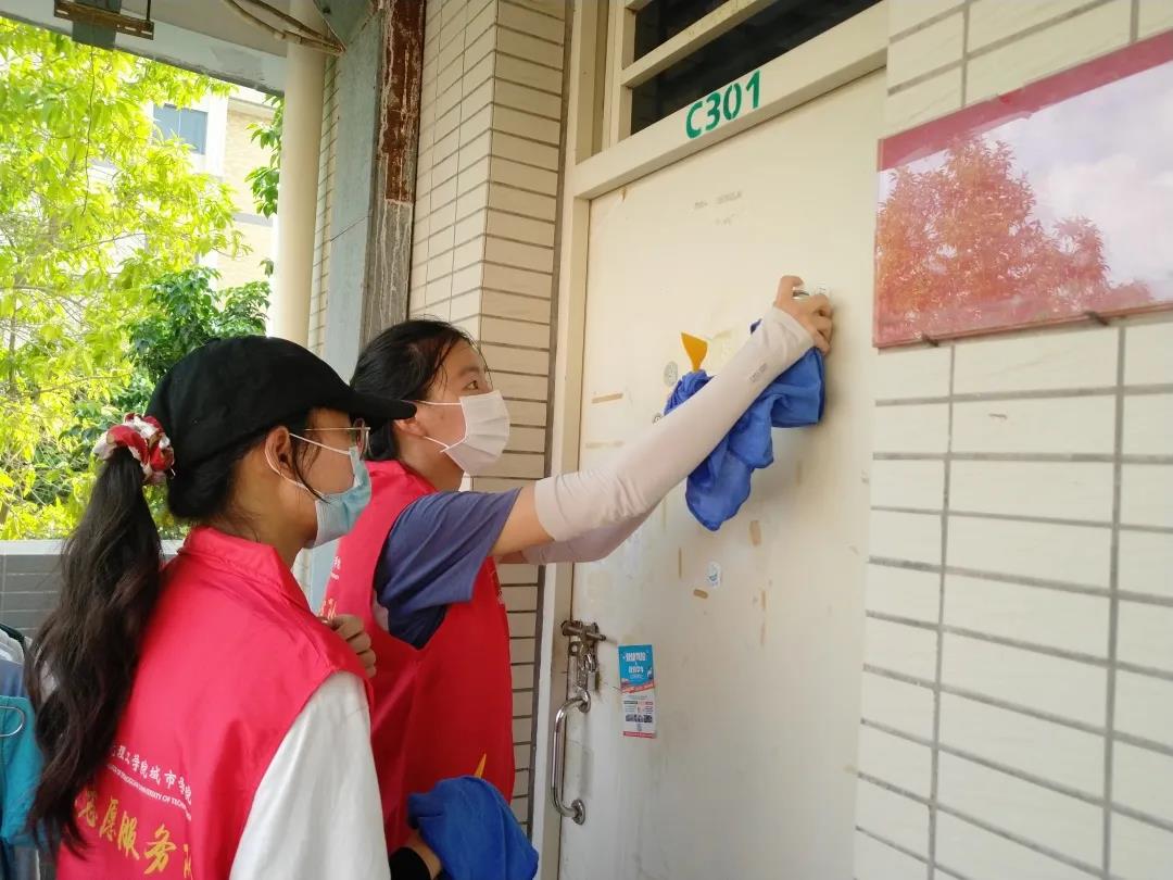 活动过程中,志愿者们身穿紫色马甲,佩戴口罩和手套,手拿小铲,依次对宿舍门上的小广告进行清理,为同学们营造一个更加整洁、和谐、舒适的住宿环境。秉持“我为群众办实事,社区解忧记使命”理念,志愿者们在行动。活动结束后,志愿者们有序归还相关物资及打扫工具,并在红色志愿队的协助下在i志愿平台进行签退。