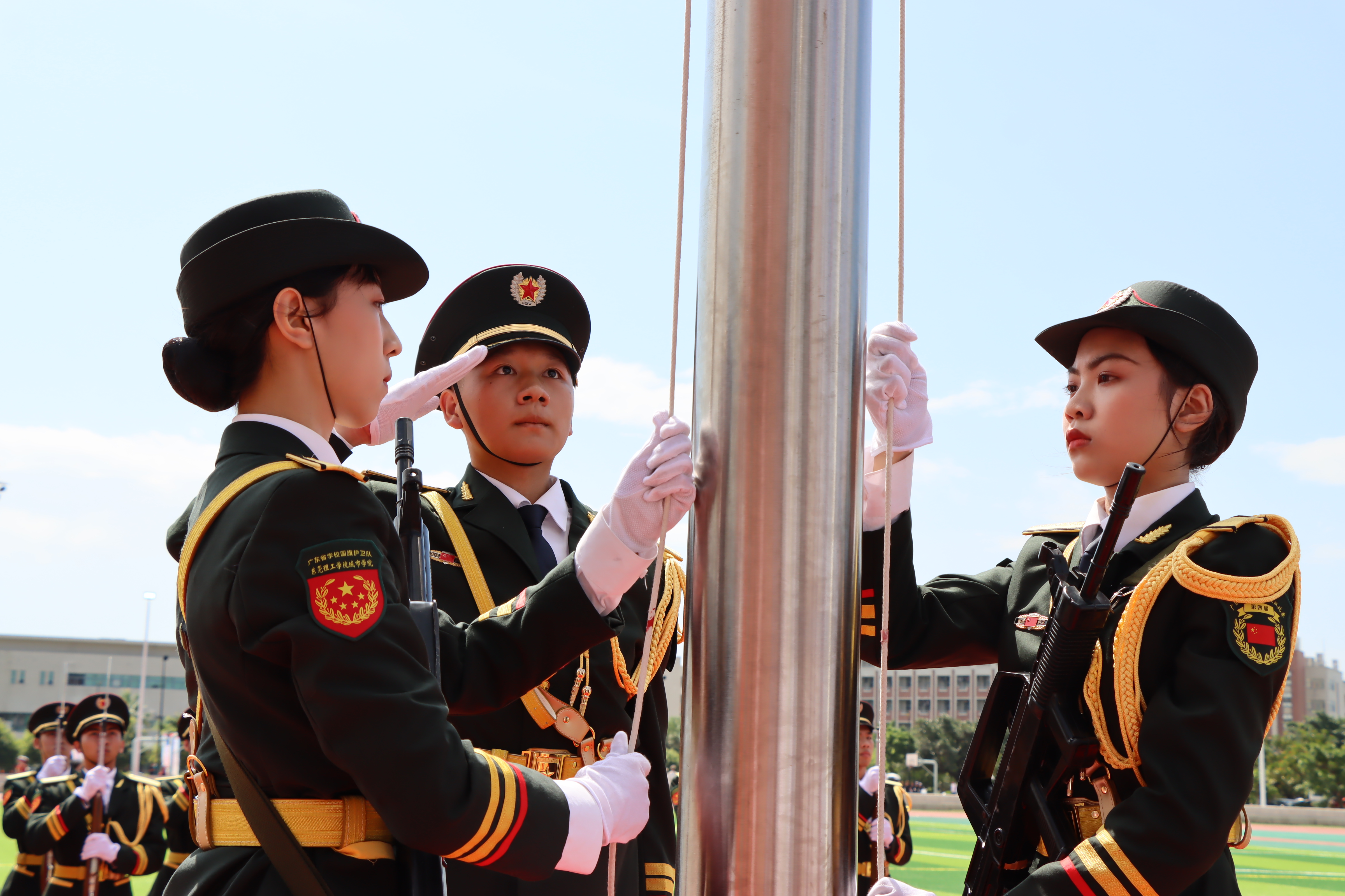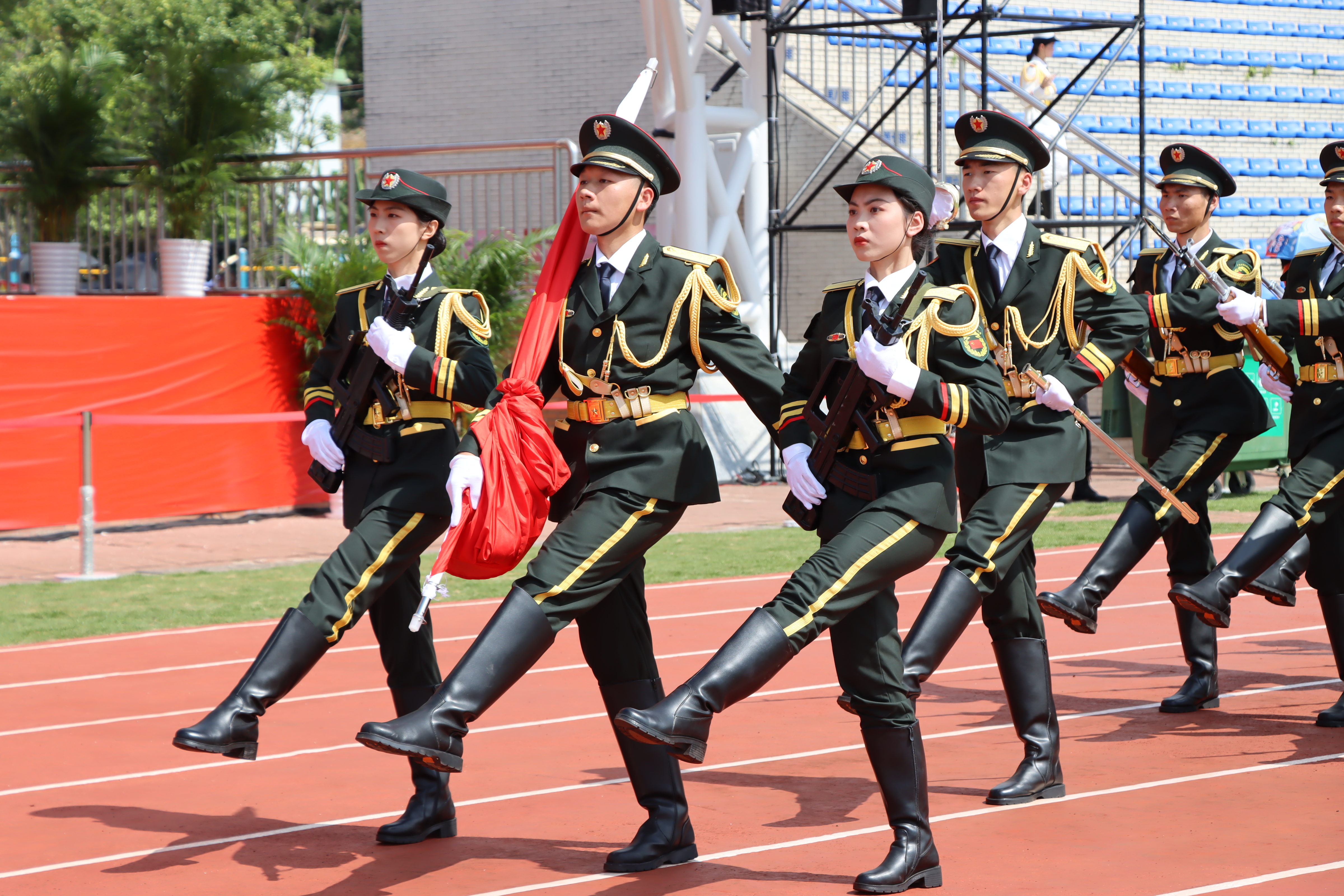 在赛场上,他们举着枪,拱卫着五星红旗,踢着正步走向升旗台,在雄壮的国歌声中,把国旗升起在湛蓝的天空上,在赛场上形成了一道独特靓丽的风景,赢得了阵阵掌声。