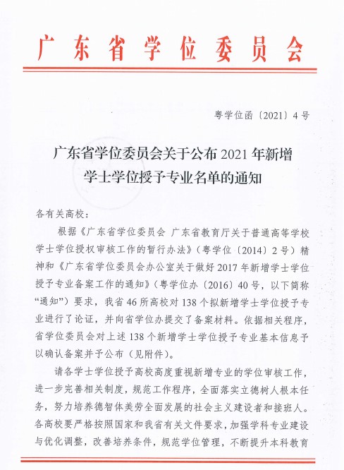近日,《广东省学位委员会关于公布2021年新增学士学位授予专业名单的通知 》(粤学位函〔2021〕4号)下发,beat365舞蹈编导、投资学、秘书学、工业设计四个专业顺利通过省学位办组织的学士学位授予专业评审,获得学士学位授予权。本次4个本科专业顺利获批学士学位授予权,是上级教育主管部门对beat365教学质量、专业建设、人才培养的充分肯定。
