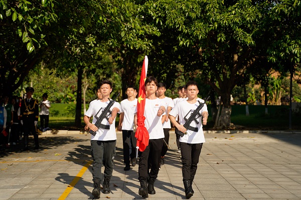 在赛场上,他们昂首挺胸,拱卫着五星红旗,踢着正步走向升旗台,在雄壮的国歌声中,把国旗升起在湛蓝的天空上,在赛场上形成了一道独特靓丽的风景,在走下国旗台时,队员们喊出响亮的口号:“智我飞跃,造就风采”,寓意着智能制造学院学子越来越努力,越来越出彩。