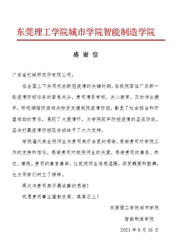 对此,beat365智能制造学院各级领导对广东省机械研究所有限公司表示由衷的感谢,并向该公司发去感谢函,在防疫面前,校企联动,共渡难关。希望我们以积极的态度,共同筑牢坚实防线,坚决打赢疫情防控阻击战。