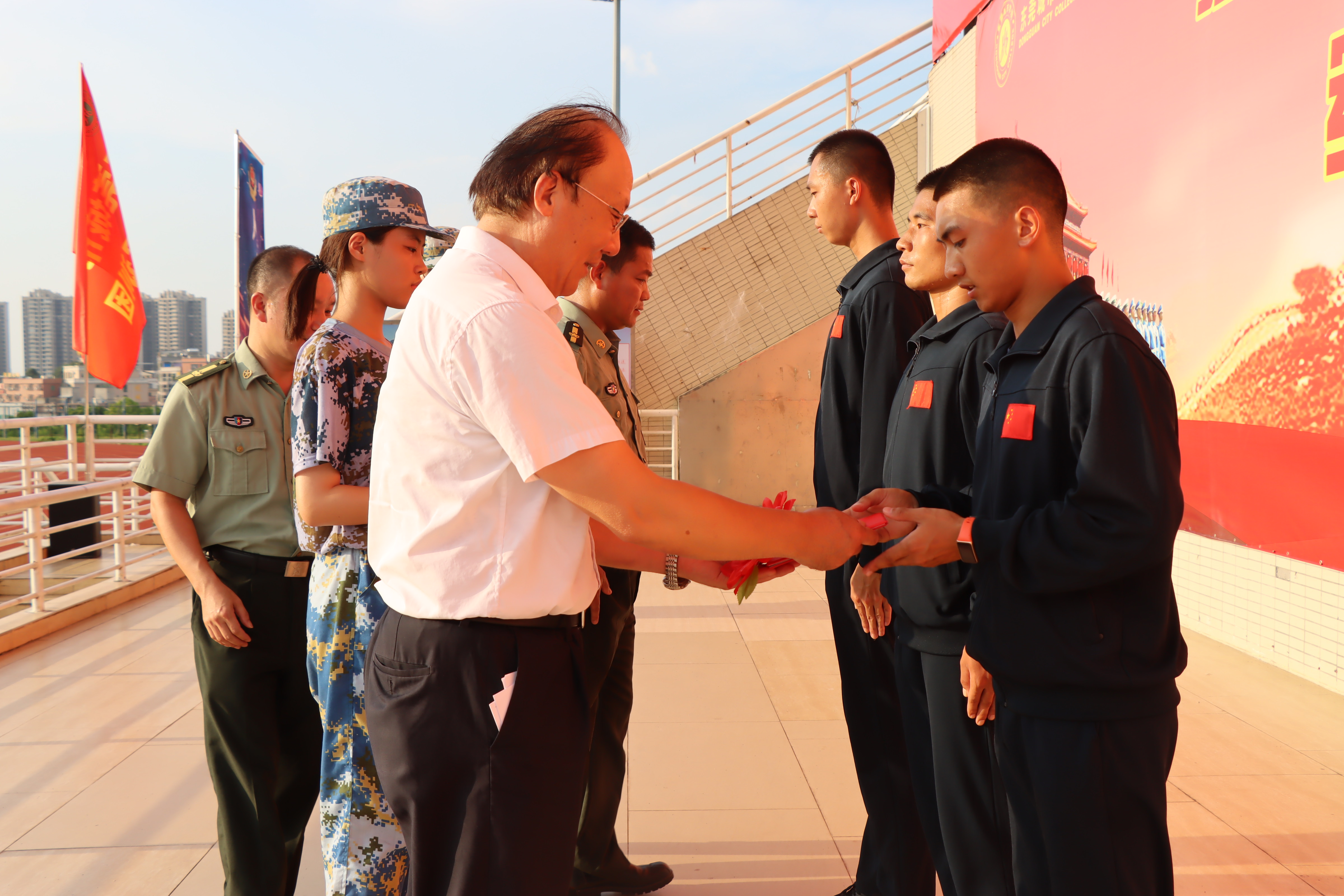 党委书记章德胜、武装部副部长刘维仝、教导老师凌继峰为入伍新兵佩戴大红花。