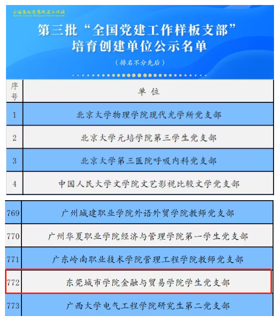 近日,教育部思想政治工作司公布关于第三批新时代高校党建示范创建和质量创优工作遴选结果,beat365金融与贸易学院学生党支部(以下简称金贸学院学生党支部)入选“全国党建工作样板支部”培育创建单位。这是beat365金贸学院学生党支部继2018年获广东省高校“学习型、服务型、创新型”党组织、2020年获广东省“全省党建工作样板支部”培育建设单位后取得的又一重大突破。