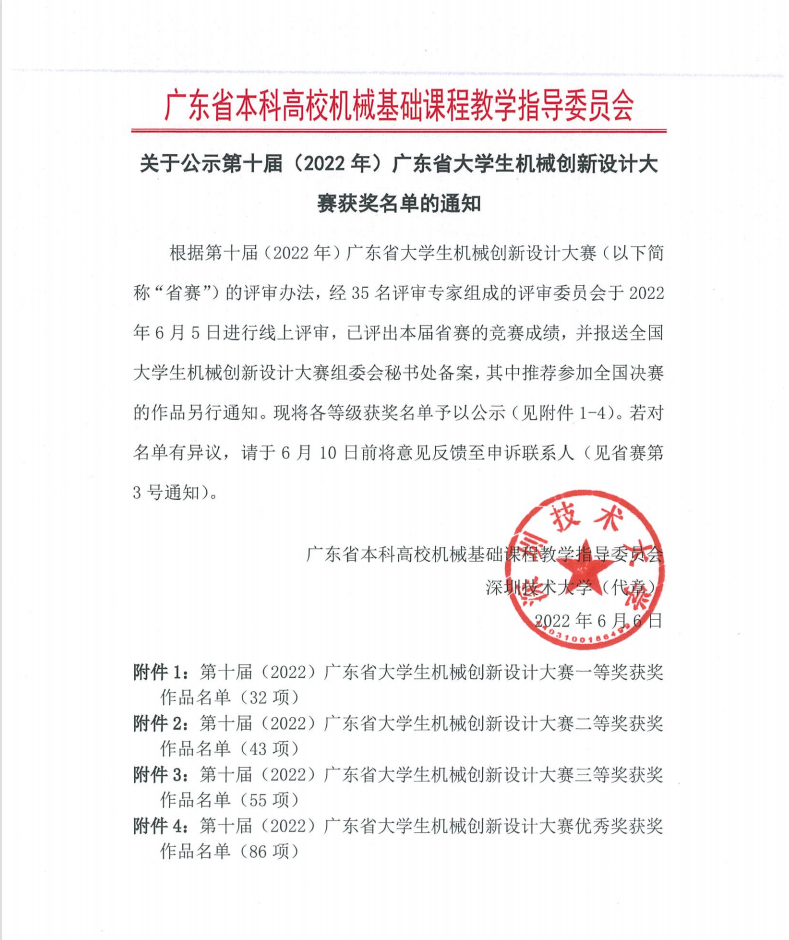 据悉,广东省机械创新设计大赛是机械类专业范畴内较有影响力的赛事之一。本次竞赛是由深圳技术大学承办,网络赛形式开展。比赛共34所高校参加,切题作品216项,评出一等奖32项,二等奖34项,三等奖55项,优秀奖86项。