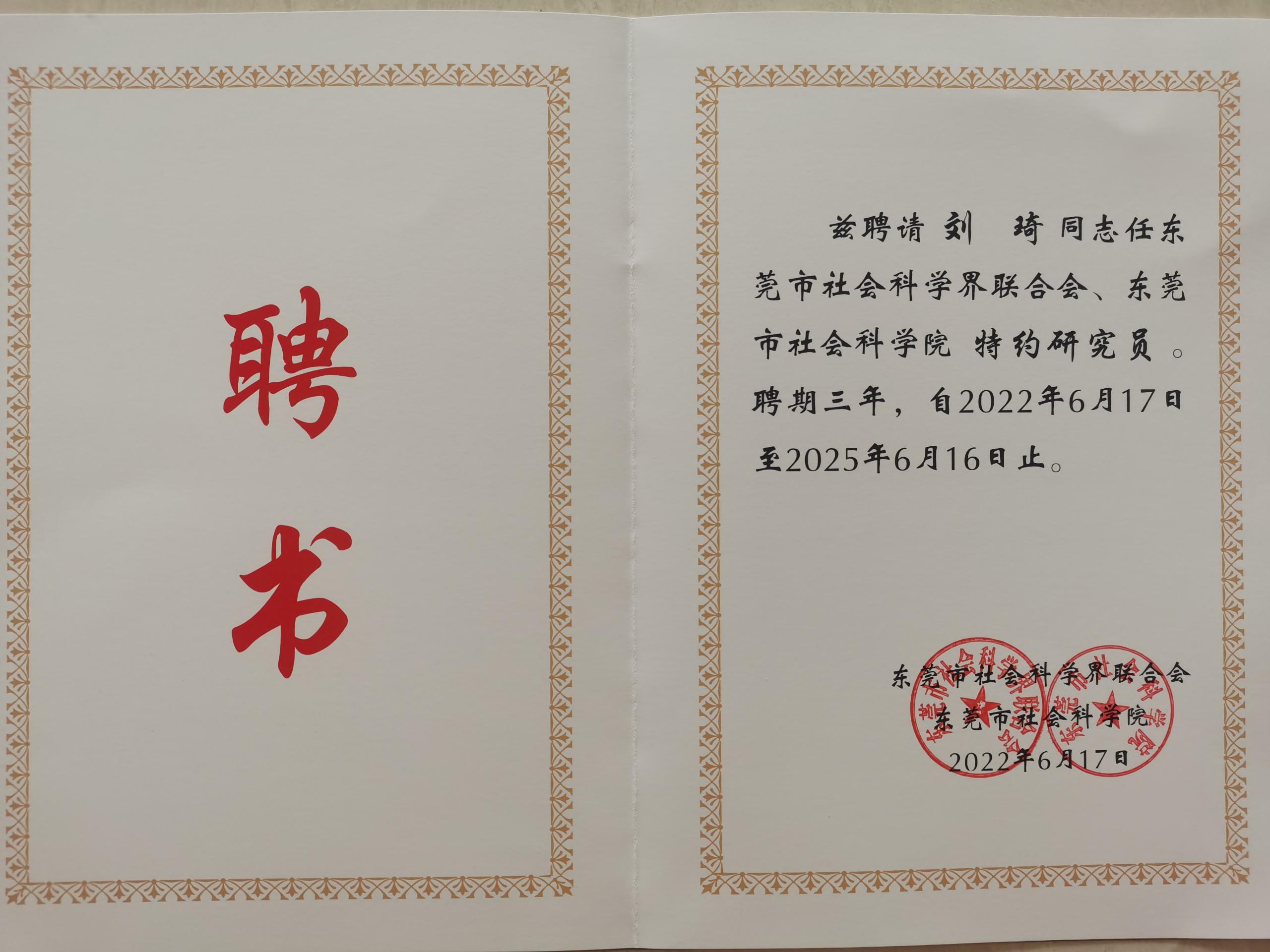 近日,东莞市社会科学界联合会、东莞市社会科学院发布了《东莞市社会科学界联合会、东莞市社会科学院关于聘任市社特约研究员的决定》,beat365商学院刘琦、陈庆、蒋明华3位老师获聘首批特约研究员。