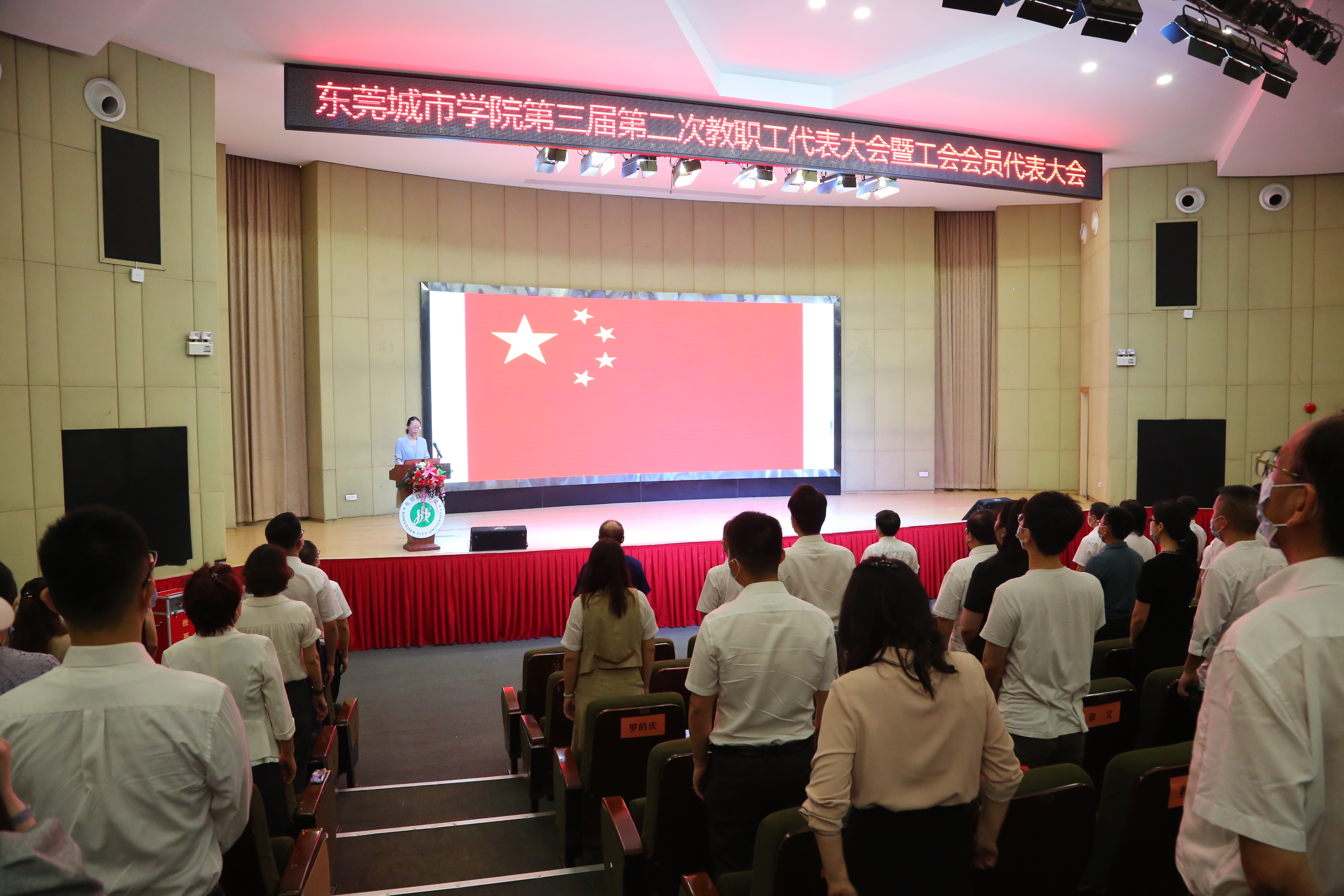 在雄壮激扬的国歌声中,大会拉开帷幕。执行校长李树英作《同心同德,干事创业,奋力推进学校高质量发展》的工作报告。报告全面回顾了学校2021-2022学年度工作情况。过去的一学年,学校完善发展顶层设计与管理领导体制设计,科学制定学校“十四五”发展规划,高标准高质量推动党史学习教育,进一步优化基层党组织设置,党建工作水平再获提升。学校坚持依法治校,全力做好新冠疫情防控工作,有效保障校园稳定。学校奋力推行人事制度改革,激发体制机制活力,不断优化师资队伍结构,提升人才队伍素质。学校招生规模创历史新高,构建了完备的三全育人体系,继续深入人才培养模式改革,进一步加强专业建设和课程建设。科研业绩大幅提升,学校启动硕士研究生联合培养,成功获批广东省博士工作站。学校不断加强国际交流与合作,构建全员参与、全领域覆盖的立体式新媒体平台,品牌建设水平不断提升。学校进一步完善校园硬件建设,新一代校园网建设完成更新,馆藏资源不断丰富,为师生提供更良好的学习生活环境。同时,李树英也指出了学校还存在一些不足之处。