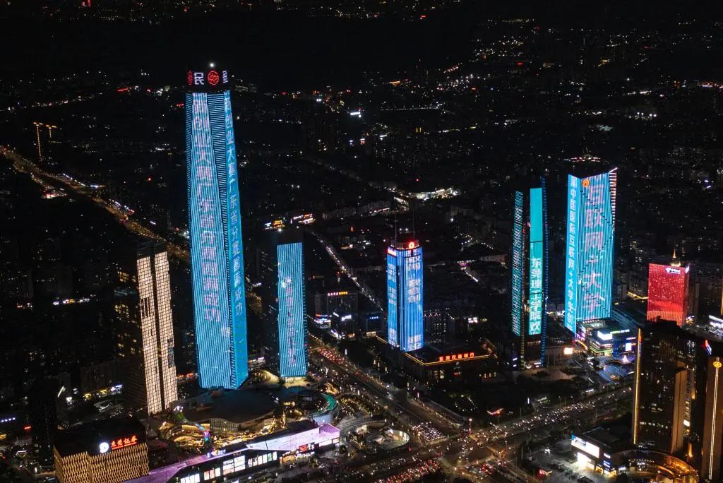 7月13日晚,东莞CBD高楼群为“建行杯”第八届中国国际“互联网+”大学生创新创业大赛广东省分赛亮灯,“互联网+”风采闪耀城市上空。