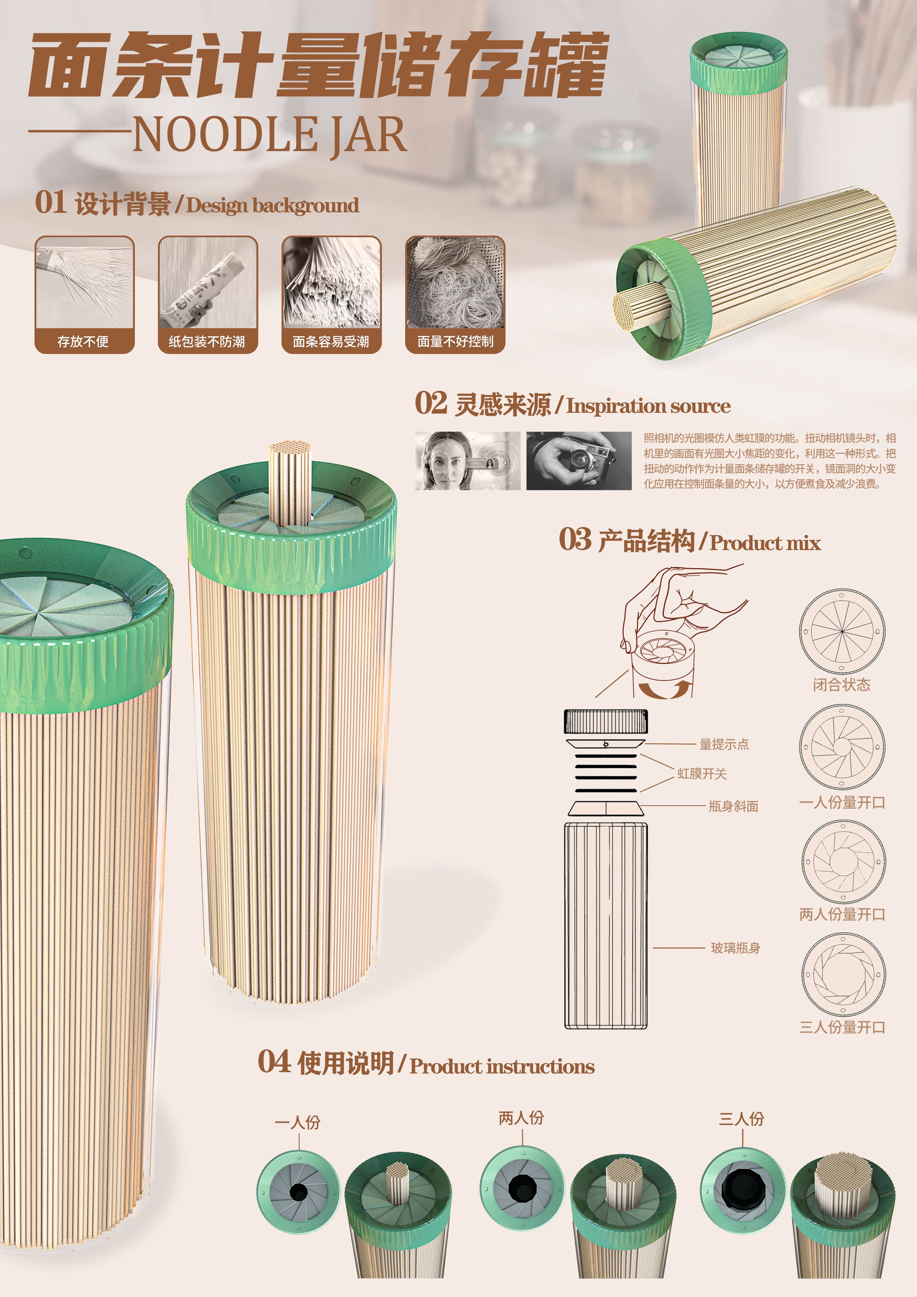 面条计量储存器灵感来源于相机的光圈,光圈的原理是模仿人眼虹膜的功能。扭动相机镜头时,相机里的画面有光圈大小焦距的变化,利用这一种形式。把扭动的动作作为计量面条储存罐的开关,孔洞的大小变化应用在控制面条量的大小,以方便日常生活中煮食及减少面条浪费。