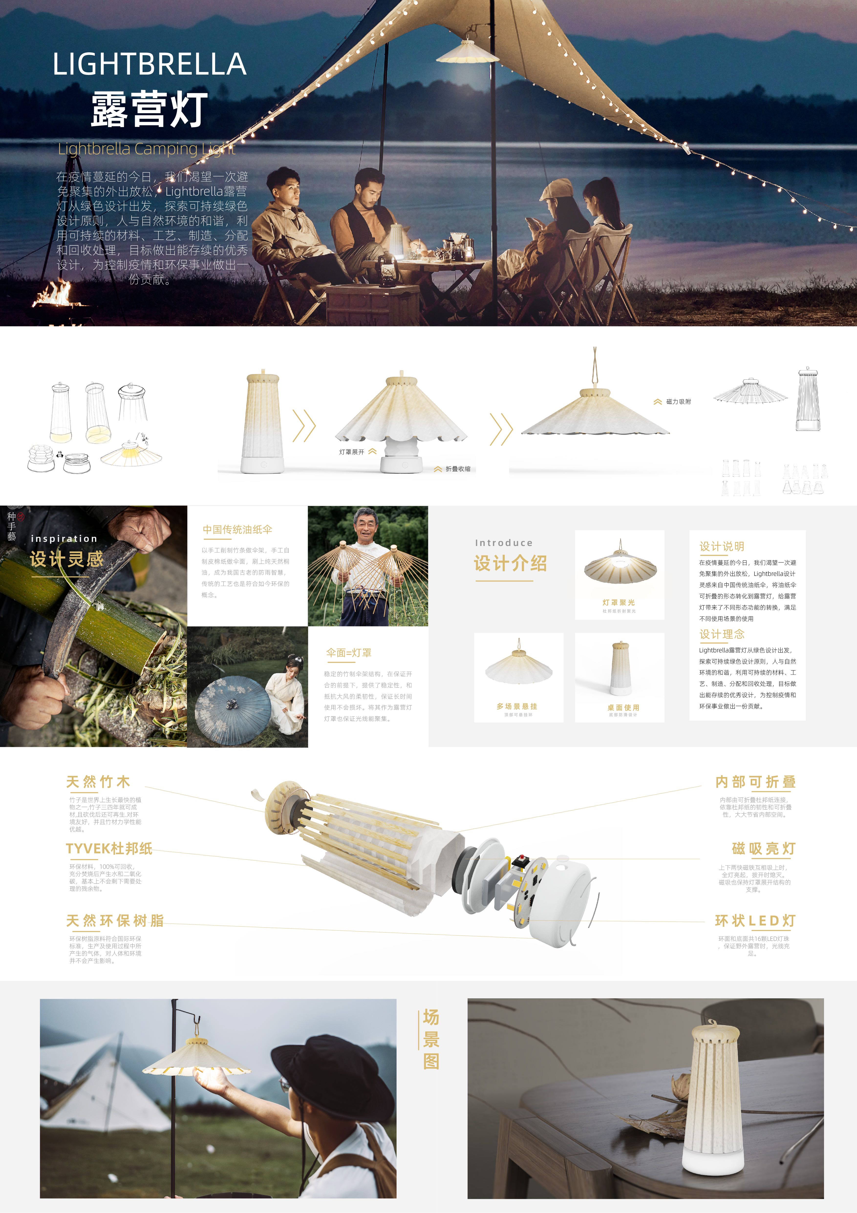 Lightbrella设计灵感来自中国传统油纸伞,将油纸伞可折叠的形态转化到露营灯,给露营灯带来了不同形态功能的转换,满足不同使用场景的使用,Lightbrella露营灯从绿色设计出发,探索可持续绿色设计原则,人与自然环境的和谐,利用可持续的材料、工艺、制造、分配和回收处理,目标做出能存续的优秀设计,为环保事业做出一份贡献。