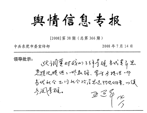 此报告以详实客观的数据,运用科学严谨的分析方法,反映了东莞市本地青年宗教信仰的一些问题,引起了市委宣传部的高度重视。市委常委、市委宣传部部长王道平同志对报告做出了批示:此调查对我们了解掌握当代青年思想情况提供了一些数据,希望多提供一些当代社会不同社会阶层思想情况调查以便参阅掌握。