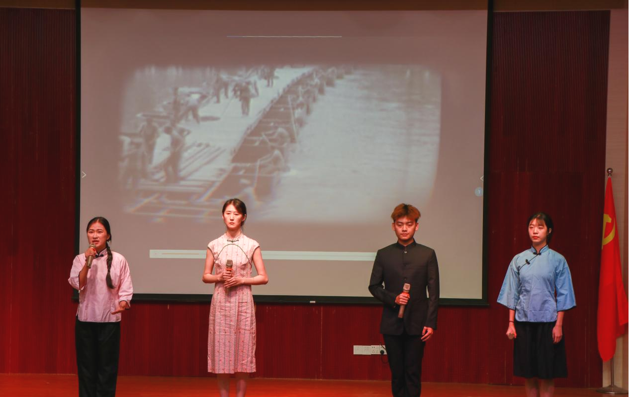 来自语言文化学院的学生党支部书记敖谦老师与三位同学演绎了红色经典诵读作品,展示了抗战时期百姓生活的艰辛与广大百姓牺牲小我成全大我,共同抗敌的爱国大义,让现场观众身临其境、心潮澎湃!