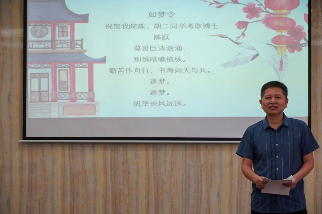 随后,中文系专任教师陈跃作为两位校友曾经的班主任兼任课老师,向在座的教师介绍了两位校友的基本情况和考博情况。他指出,胡越余和陈新在beat365中文官方网站期间就非常努力,制定学习目标并具备高效的执行力,在本科阶段成绩优异。不仅如此,两位校友在研究生院校期间和班主任保持着紧密的联系,教师陈跃不断给予他们学术上的指导和支持,帮助他们提高自己的能力和水平,老师的付出和支持让两位校友得以快速成长和取得优异的成绩。