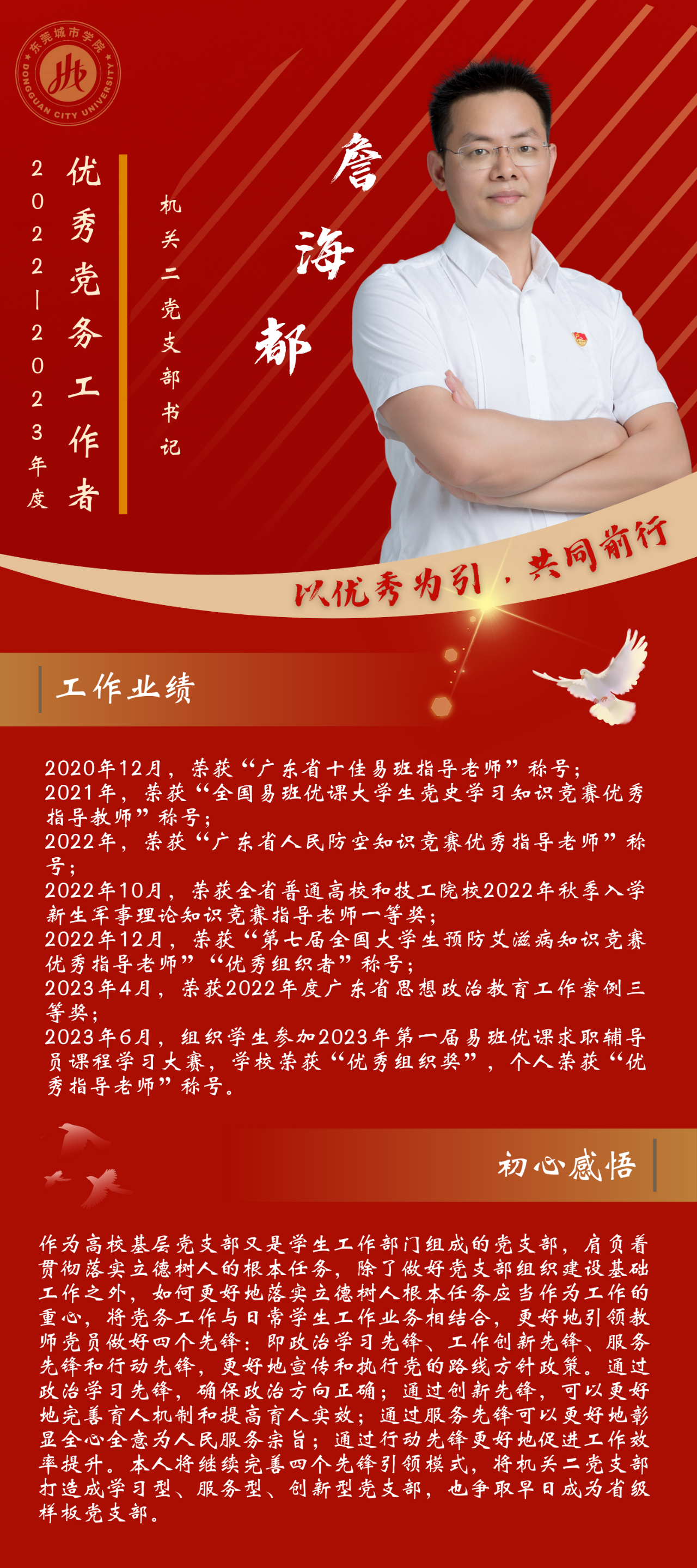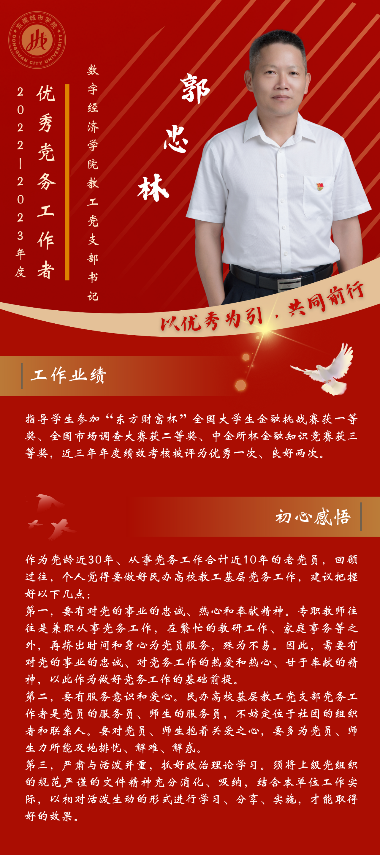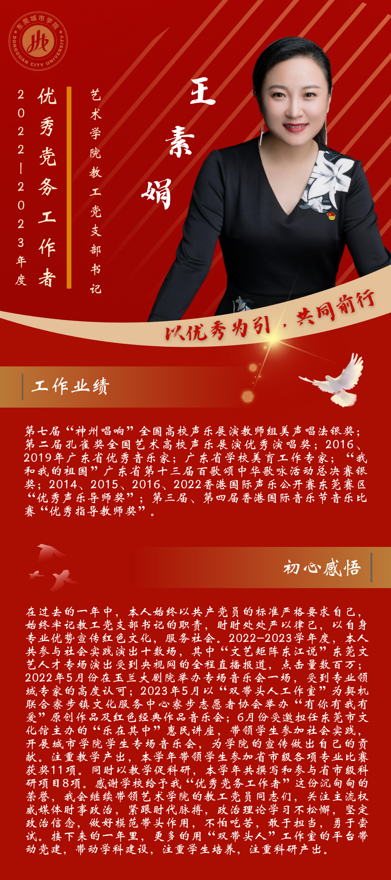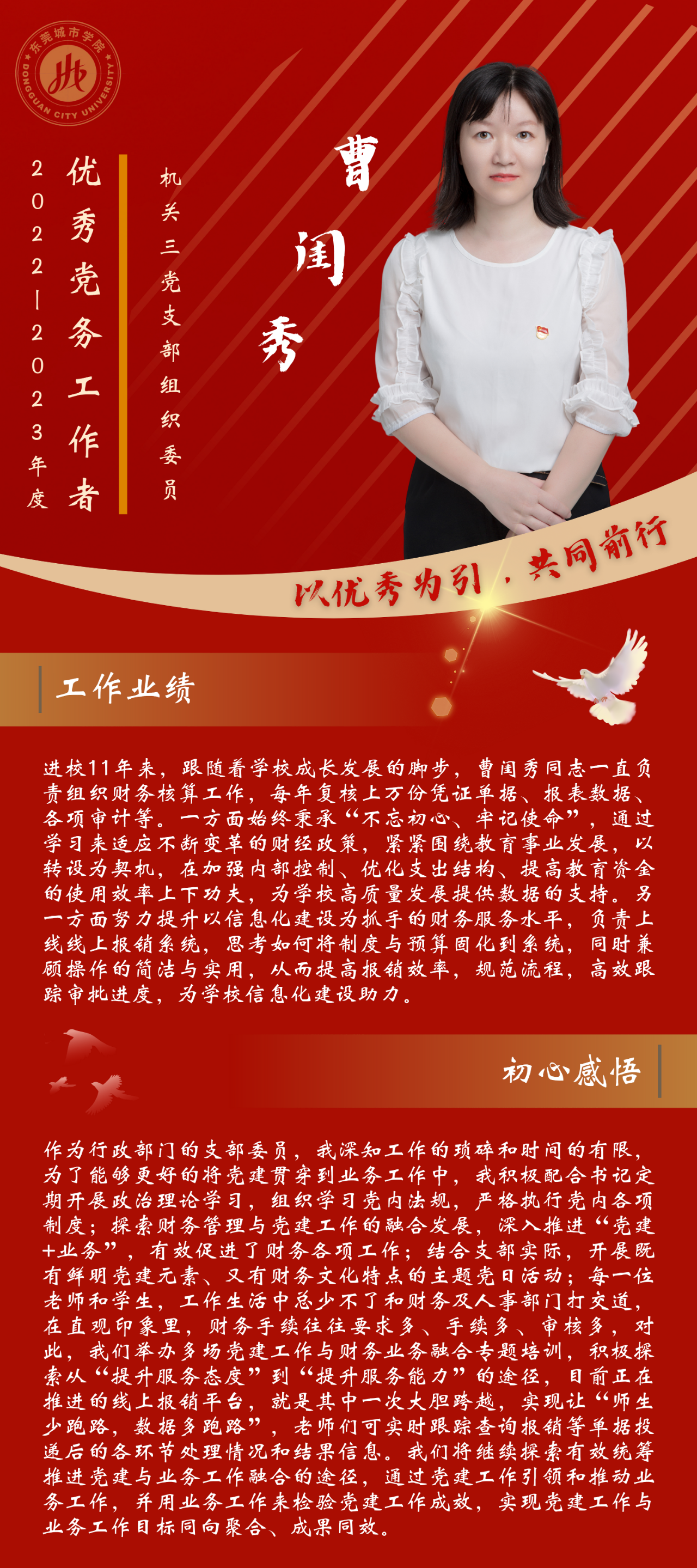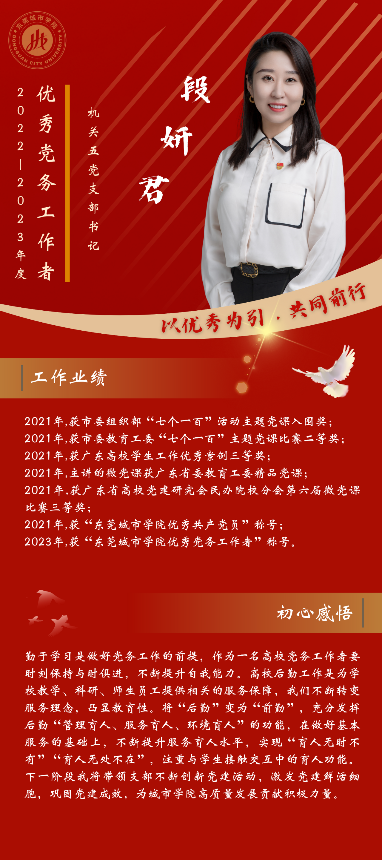 一名党员,就是一面旗帜。为发挥先进典型的示范作用,弘扬党的光荣传统和优良作风,我们推出“优秀党务工作者”风采展,充分展示beat365广大党员干部坚守初心使命、勇于担当作为的政治本色。让我们向优秀学习、向先进看齐,在新时代新征程中展现新作为新担当,不断开创学校教育事业发展新局面。