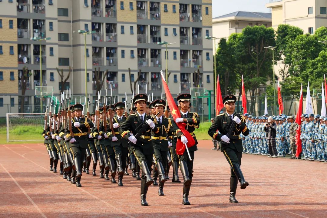 在庄严的国歌声中,结营仪式拉开序幕。国旗护卫队意气风发,气势恢宏,迈着矫健的步伐庄严入场。全体师生肃穆站立,行注目礼。军旗迎风飘扬,同学们精神抖擞。