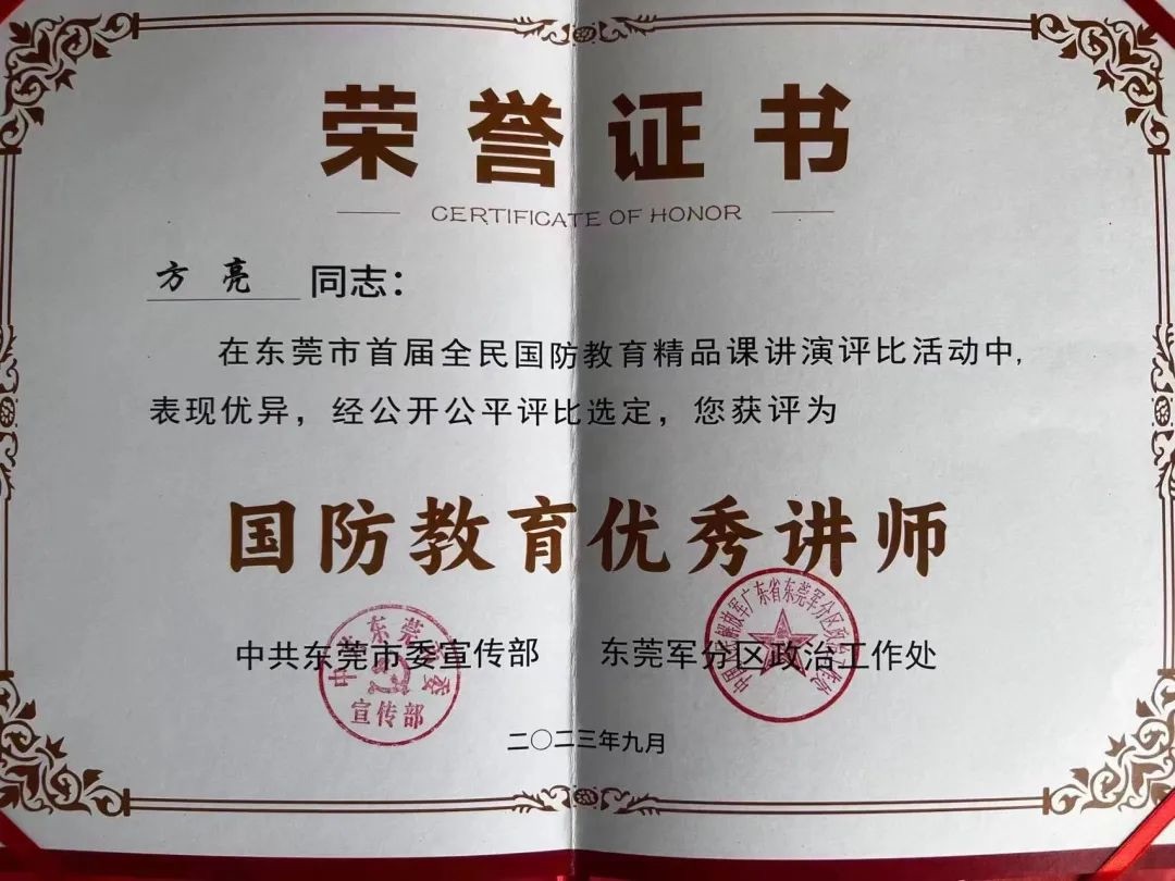 为全面建设社会主义现代化国家、全面推进中华民族伟大复兴贡献磅礴力量。2023年9月,中共东莞市委宣传部和东莞军分区政治工作处联合主办开展东莞市首届全民国防教育精品课暨国防教育优秀讲师评比活动决赛,beat365语言文化学院网络与新媒体系专任教师郭戈在此次活动中表现优异,经公开公平评比选定,被评为国防教育优秀讲师。