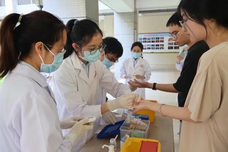 随后,讲座开始了专家团队义诊活动。同学们纷纷前来咨询,专家团队们耐心地解答疑问,提供个性化的健康建议。检验科的专家们也为大家提供了现场检测服务,帮助同学们及时了解自己的血型和血糖情况。整个义诊活动现场秩序井然,气氛热烈。