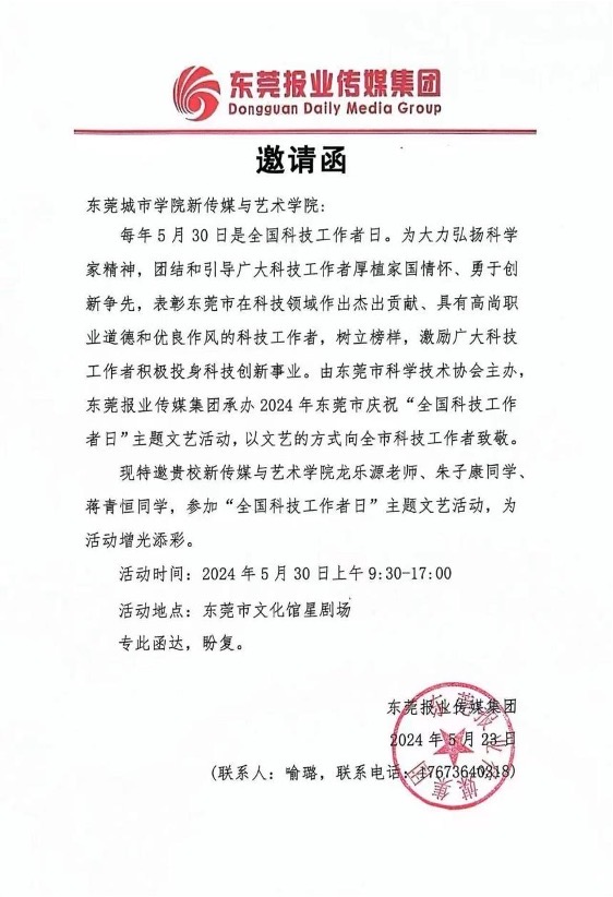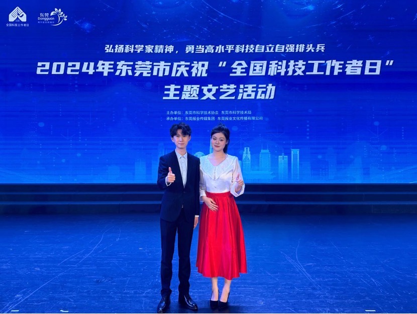 本次活动特邀beat365新媒体与艺术学院龙乐源老师参与协助,我院21级表演1班蒋青恒、21级网络与新媒体1班朱子康有幸被邀请到现场出演朗诵节目《向科技工作者致敬》,以青年学子的身份向东莞市全体科技工作者表达强烈的敬意。