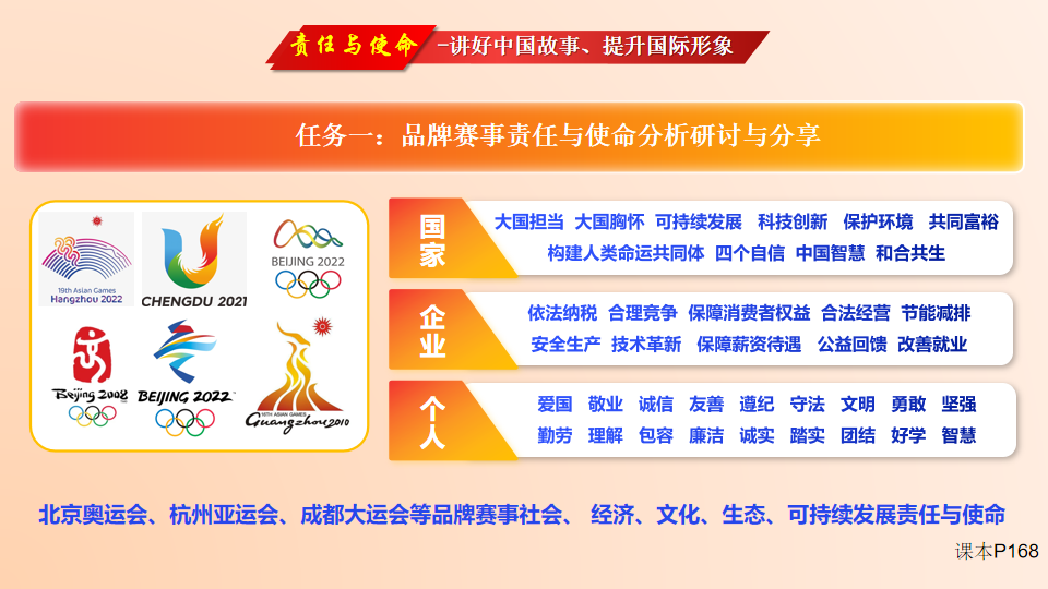 课上,袁老师首先分析了当前我国正由生产强国向科技强国、品牌强国迈进的背景,提出国家、企业、个人三个层面的责任和社会使命,以及三者之间的关联性、统一性。然后,以北京奥运会、杭州亚运会、成都大运会等为例,引导学生共探式了解赛事活动的理念识别系统中隐含的社会、经济、文化、生态、可持续发展的责任与使命。