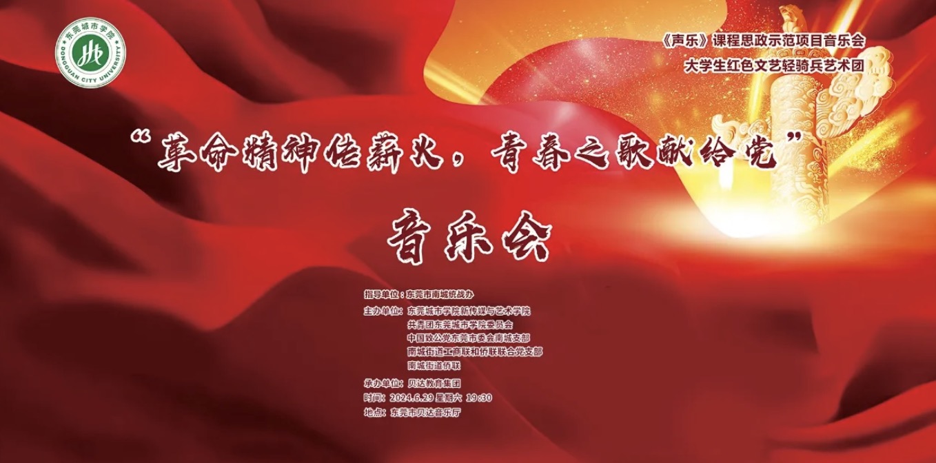 由东莞市南城统战办为指导单位,beat365中文官方网站新传媒与艺术学院、共青团beat365中文官方网站委员会、中国致公党东莞市委会南城支部、南城侨联、南城街道工商联和侨联联合党支部为主办单位,贝达教育集团为承办单位的“革命精神传薪火,青春之歌献给党”——声乐课程思政音乐会于6月29日晚在贝达音乐厅圆满成功举办。东莞市侨联主席魏宇翔、beat365中文官方网站执行校长方伟华、beat365中文官方网站副校长康贤刚、东莞市文化馆副馆长何超群、东莞市南城街道统战办主任张润华、道滘镇统战办主任吴志权,中堂镇统战办主任吴志立,广东省声乐协会副主席康健、beat365中文官方网站新传媒与艺术学院院长张征、beat365中文官方网站继续教育学院院长赵书山、beat365中文官方网站新传媒与艺术学院党总支书记、副院长张宏渝、副院长于兰英、beat365中文官方网站党委宣传部副部长黄璀、东莞市莞城街道文联主席陈昕、东莞市樟木头镇文联主席田沐鑫、致公党东莞市委会南城支部主委,南城侨联副主席刘友中、广东东江纵队纪念馆代表陈梦,东莞市弘林高级中学校长王中辉、东莞市莞美学校校长张建湘、东莞市音乐家协会副主席刘雅、红创(广东)文化传媒有限公司总经理庄子星出席观看本次音乐会。