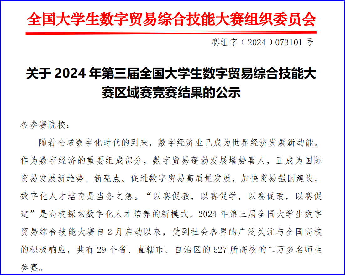 大赛从每年2月启动,9月底结束,分校赛、区域赛、国赛三个阶段进行,分成创新创业、大数据分析、跨境直播、留学生案例四个赛道进行PK,区域赛分华北、东北、华东、华中、华南、西南、西北七个区域进行,2024 年第三届全国大学生数字贸易综合技能大赛自2月启动以来,受到社会各界的广泛关注与全国高校的积极响应,共有29个省、直辖市、自治区的527所高校的二万多名师生参赛。