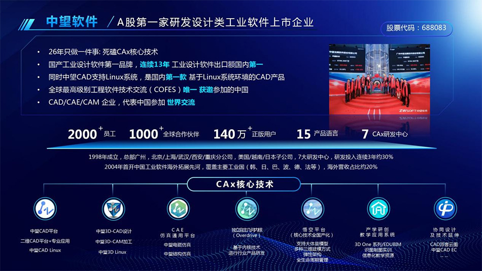 作为中国最大、最专业的CAD/CAM软件研发与推广国家高新技术企业,广州中望龙腾软件股份有限公司除了深耕国内市场,还积极拓展国际市场,自2004年起开始将国产CAD软件出口海外。截至目前,中望在全球有7大研发中心,开发商及渠道合作伙伴超过1000家,系列软件产品已经畅销全球90多个国家和地区,正版授权用户突破140万。