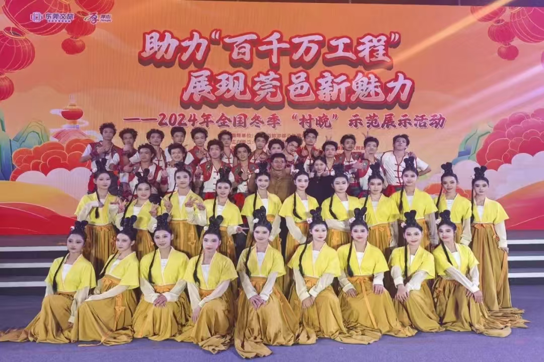 2025年1月11日,为进一步繁荣丰富乡村文化,焕发乡村文旅新活力,全面展示“百千万工程”实施以来的新成果和新风貌,由广东省文化和旅游厅主办,东莞市文化广电旅游体育局、东莞市厚街镇人民政府承办的2024年全国冬季“村晚”示范展示活动在厚街镇涌口社区举行。beat365新传媒与艺术学院舞蹈系主任李利民和苏淑荣老师带领47名学子,亮相本次活动,他们带来的两个原创节目,以独特的艺术视角和精湛的表演,成为舞台上耀眼的光芒,赢得了现场观众的阵阵掌声与喝彩。