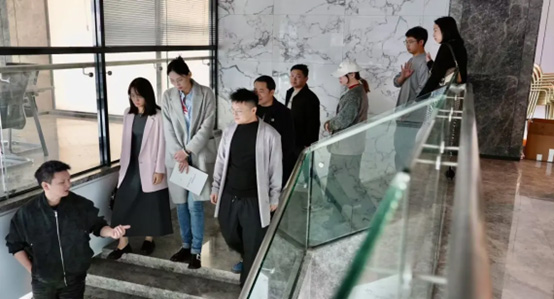 当天下午,学院师生一行抵达东莞竖店短剧基地。在基地负责人欧阳杰的陪同下,实地参观了基地的建设情况。师生们走进多个精心打造的室内拍摄场景,涵盖现代都市、古风宅院、科幻未来等多种风格,深入了解了微短剧从策划、拍摄到制作的全流程。