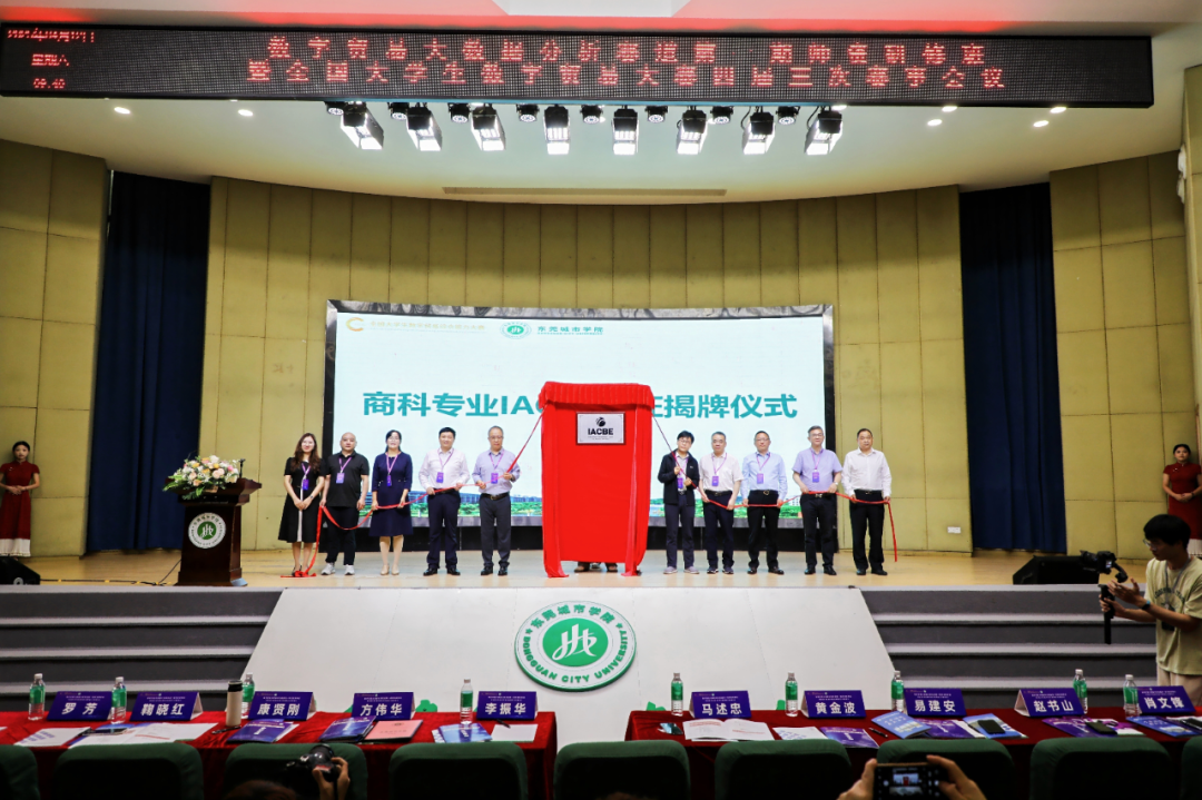 商科专业IACBE认证揭牌仪式上,浙江大学中国数字贸易研究院院长马述忠,深圳大学经济学院教授黄金波,大赛组委会秘书长易建安,beat365中文官方网站校长李振华,执行校长方伟华,副校长康贤刚,校长助理、国际教育学院院长赵书山,教务部副部长鞠晓红(主持工作),商学院副院长肖文锋、罗芳共同执牌揭幕,见证商学院商科教育国际化进程的重要里程碑。