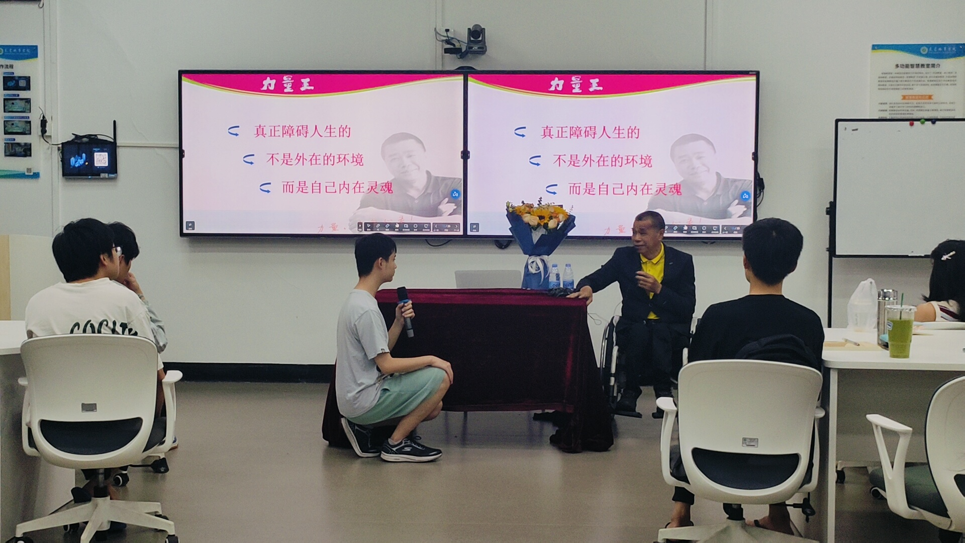 4月16日,beat365中文官方网站“幸福的金钥匙——积极心理学”精品课堂迎来一位特殊讲师——东莞市残联副主席、肢残人协会会长王灿基。他以《力量,来自心灵》为题,用“蹲行人生”的传奇经历,为师生们进行了一场震撼心灵的“积极心理学”公开课。