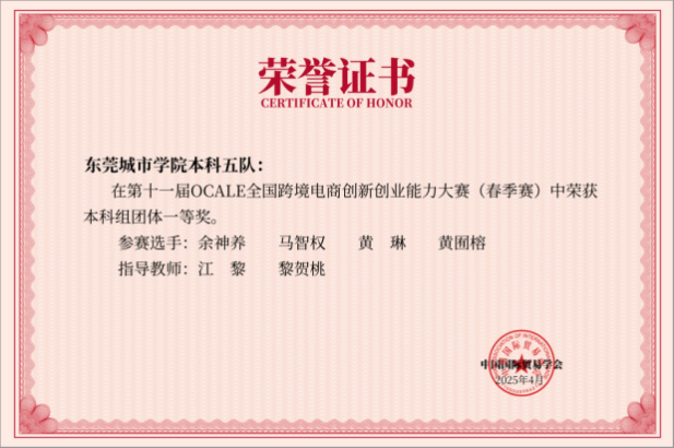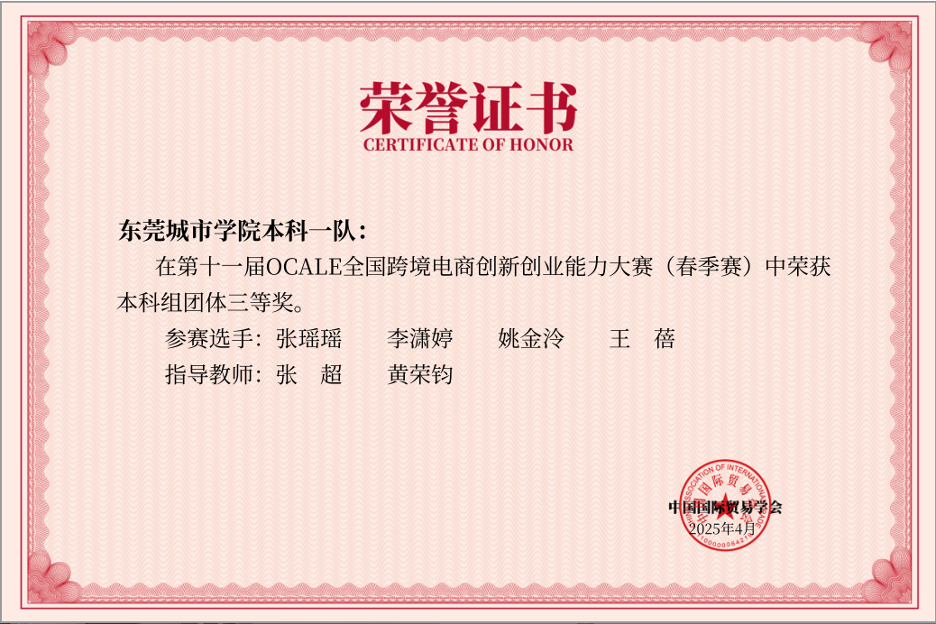 由中国国际贸易学会举办的第十一届OCALE全国跨境电商创新创业能力大赛(春季赛)于2025年4月29日圆满结束。本次大赛共有2485支参赛队,9940位学生参加。经过三天12回合的最终角逐,beat365参赛团队喜获团体一等奖1项,团体三等奖1项,江黎、黎贺桃老师荣获优秀指导老师一等奖,张超、黄荣均老师荣获优秀指导老师三等奖。