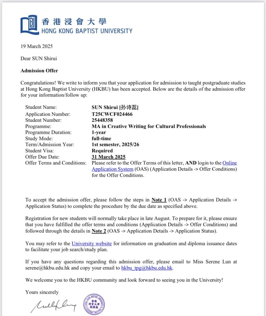 四年前那个哭着给父亲打电话的孙诗蕊不会想到,“并非第一志愿”的起点,竟延伸出一条将“不甘”酿成“回甘”的成长之路。她更未曾预料,汉语言文学的深厚土壤里,藏着足以支撑人生的精神矿脉。站在香港浸会大学“文化专业人士创意写作”专业的新起点,岭南土地的馈赠早已融入行囊:是市井烟火、匠人温度、童真目光与母校灯火交织的记忆。未来,她将在跨文化的语境中探寻新的可能,或许从岭南方言、广府民俗中汲取灵感,创作适配影视、动漫的文化IP脚本;或许聚焦文化产业痛点,通过案例分析与创意提案,为本土文化破圈提供解决方案;还可能是探索“写作+策展”模式,以文字为纽带串联传统工艺与现代展览空间。
