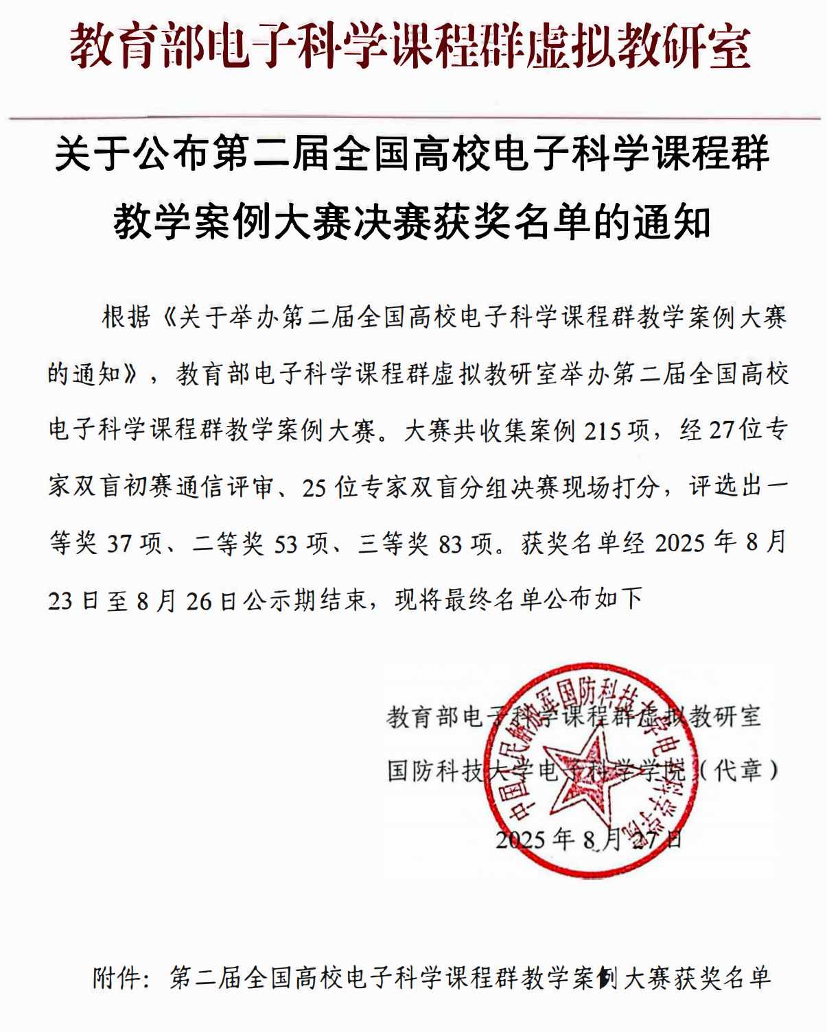 大赛由教育部电子科学课程群虚拟教研室和电路与电子学虚拟教研室共同组织,国防科技大学、网络空间部队信息工程大学、电子科技大学联合主办,面向全国电子信息类课程征集教学案例,覆盖智慧教学案例、工程应用案例、军事应用案例、课程思政案例等四个赛道。本次大赛有国防科技大学、电子科技大学、西安电子科技大学等45所高校参加。