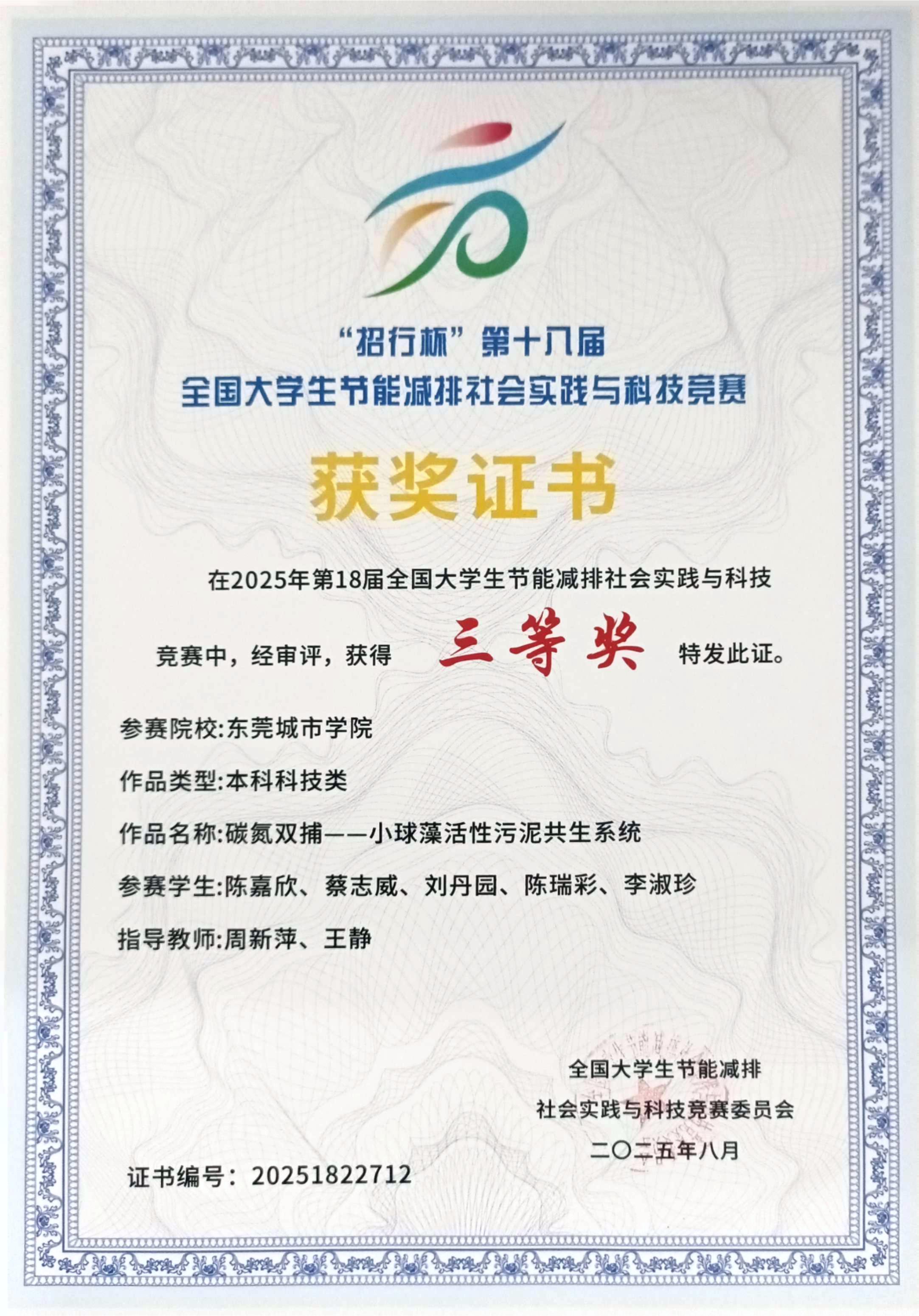 在本次竞赛中,beat365城建与制造学院环境工程专业周新萍、王静两位教师指导的陈嘉欣、蔡志威、刘丹园、陈瑞彩、李淑珍5位跨年级学生组成的团队,凭借项目“碳氮双捕——小球藻活性污泥共生系统”,从全国692所高校报送的7736件参赛作品中脱颖而出,荣获全国三等奖,彰显了团队在环保技术创新领域的突出实力。