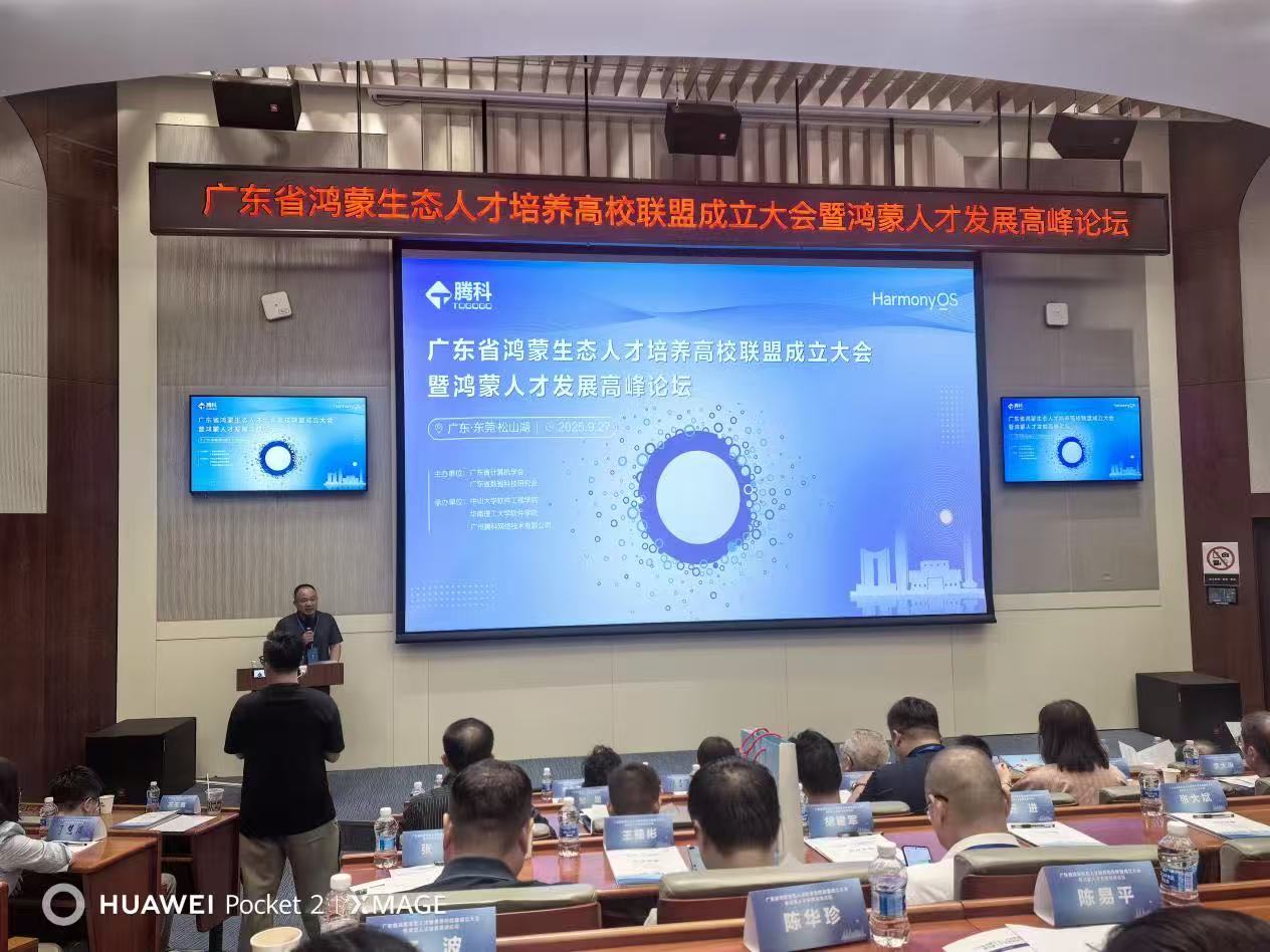 本次大会由广东省计算机学会、广东省数智科技研究会联合主办,中山大学软件工程学院、华南理工大学软件学院及广州腾科网络技术有限公司共同承办,华为软件技术有限公司协办。会议聚焦鸿蒙操作系统生态建设、人才培养体系构建与产学研协同创新等关键议题,并宣布广东省鸿蒙生态人才培养高校联盟正式成立。