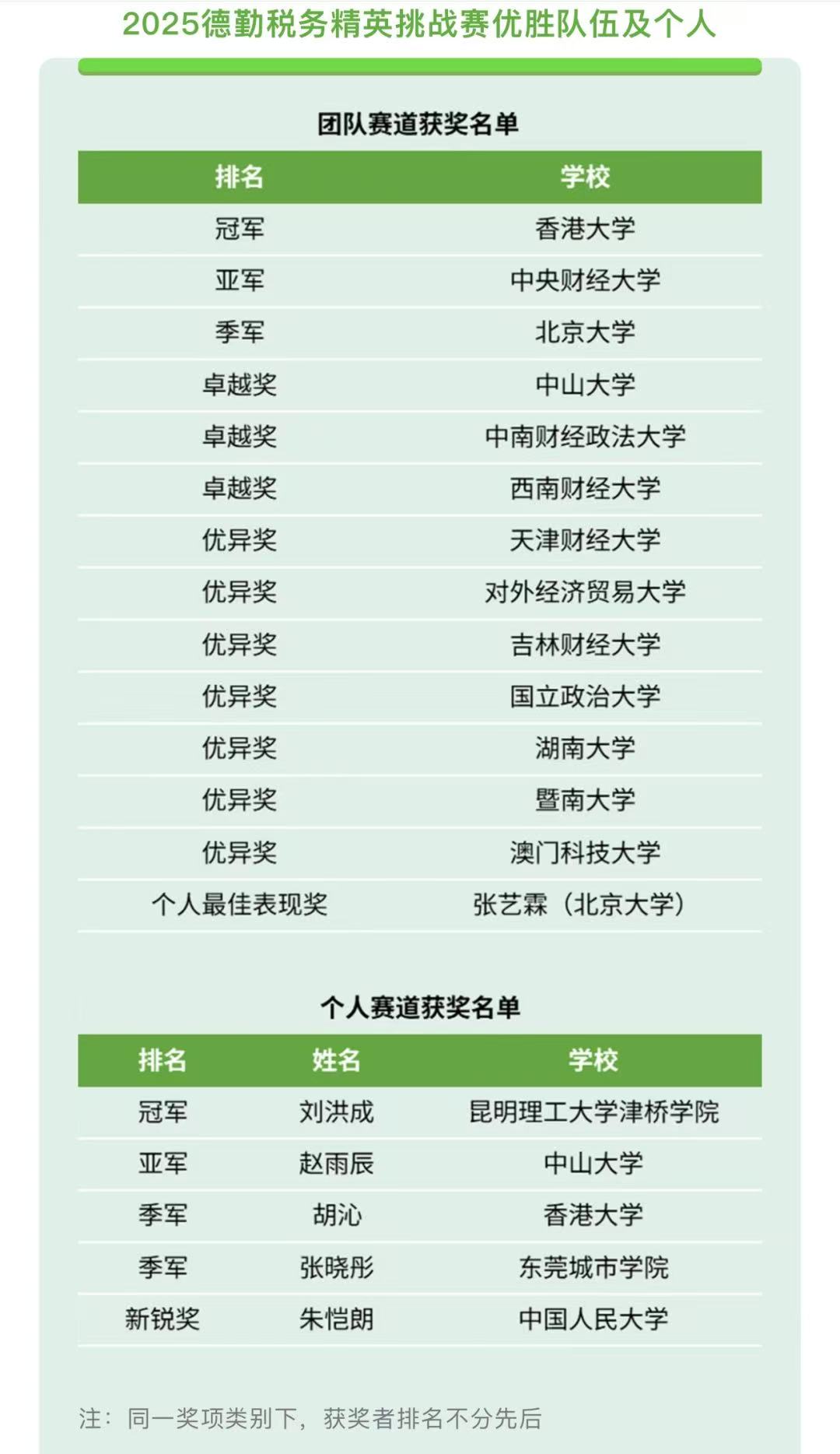 德勤税务精英挑战赛被誉为大中华区税务领域的“奥斯卡”,竞争异常激烈。让我们看看本次比赛的获奖阵容,便可知其分量:团队赛道豪强云集:冠军香港大学、亚军中央财经大学、季军北京大学、卓越奖中山大学、中南财经政法大学等。