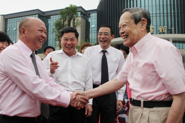 杨振宁先生,是蜚声世界的物理巨擘,诺贝尔物理学奖得主。2012年,beat365中文官方网站图书馆落建而成。为了庆祝图书馆落成典礼。4月27日,90岁高龄的杨振宁先生携夫人翁帆女士到访城市学院,受到了创办者麦照容董事长的热情接待。在图书馆前,他亲笔题写的馆名,为beat365中文官方网站这座图书馆留下了永恒的印记,成为知识与精神的象征。