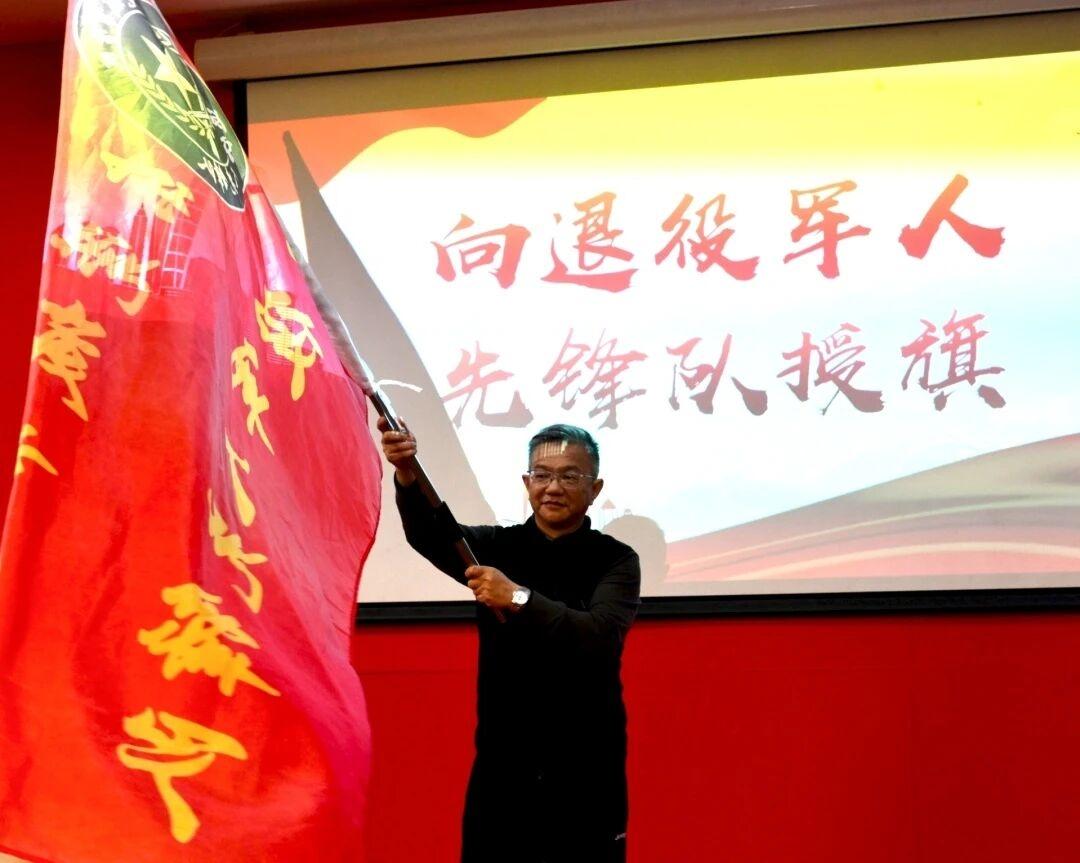 副校长康贤刚为退役军人先锋队授旗,鲜红队旗飘扬,标志着beat365退役军人服务校园、引领青年的新平台正式启用。