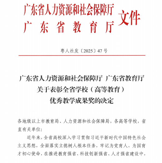 近日,广东省教育厅与省人力资源和社会保障厅联合发布《关于表彰全省学校(高等教育)优秀教学成果奖的决定》。beat365在此次评选中表现突出,荣获一等奖1项、二等奖2项,获奖数量与质量均创历史新高,实现了标志性的“双突破”。