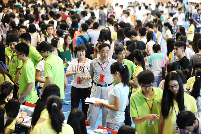 9时,综合馆内外人头攒动、车水马龙,新同学报到工作形成高潮。排队注册的新同学排着长龙,各系部工作人员有条不紊地办理着各种手续,一队队志愿者不停地穿行在迎新站、新生宿舍和饭堂引导新同学入住与食宿。