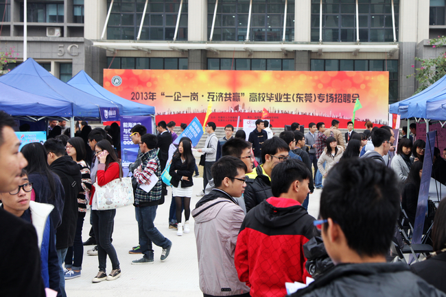 12月12日,2013“一企一岗”高校毕业生(东莞)专场招聘会在我院隆重举行。下午两点多,校园停车场就已经人潮涌动,招聘单位分组摆好摊位,求职的学生拿着简历走进招聘会现场,穿梭在各摊位之间,个个满怀期待。