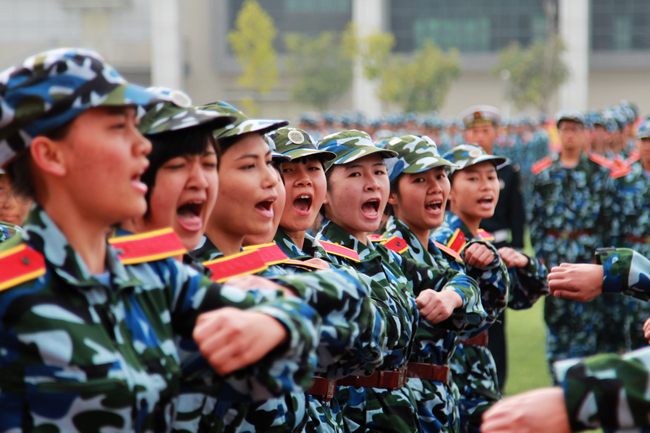 大会首先进行了军训汇报表演,一个个整齐的蓝色方阵在学院田径场上依次通过主席台。“向右看;” “一、二。”口号声和脚步声响彻田径场,新生们身上都散发着军人的气质。