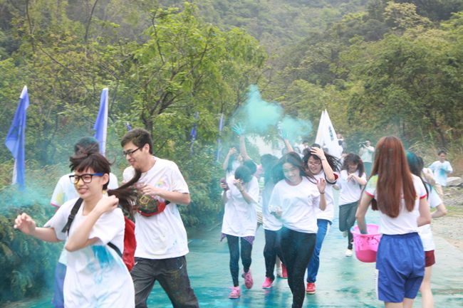 天公作美,顺利抵达清溪后,在志愿者的指引下同学们井然有序地领到了彩色跑专属白T,便迫不及待地奔向彩色跑道,拥抱这一路“热情”的彩色粉料。两面印有“东莞理工学院城市学院”标志的旗帜带领着师生们向一个个站点迈进。在慢跑中尽情地沐浴着清新的空气,呼吸着花草的芳香,潺潺流水,幽静的盘山道也因广大彩色跑参与者的到来,在春日里焕发出别样的风采。活动全程3.5公里,设置五个色彩站,同学们经过的时候从头到脚都被抛洒上不同颜色的粉料,五颜六色的粉料在大家的身上留下了属于各自的青春印记,瞬间变成一个个“彩人”,惬意享受着彩色跑带来的轻松与欢乐。