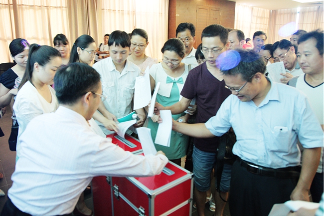 65名教职工代表对11个机关教辅部门负责人的工作绩效进行了民主测评。