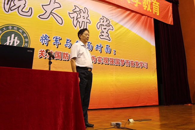 接着,秦将军结合自己在部队46年的军旅生涯,给同学们讲了三个问题:一、叙利亚、乌克兰等国动乱的国际影响;二、周边国家政治危机对我国所造成的严峻的安全形势,企图遏制中国发展的阴谋;三、国防建设的重要性。“战争态势已经从冷兵器时代转化为向海陆空一体化的战争,对此我们要有充分的思想准备和足够的物质基础,掌握和平的主动权。我们的国防力量在发展强大,但也应清醒地看到我国与发达国家的差距,我们必须迎头赶上去。你们是祖国的新一代,未来终究靠你们,祖国在呼唤人才!”讲到这里,秦将军热切希望同学们不忘国耻,不让历史悲剧重演,中国要强大起来,立于世界民族之林,不能丢失一寸国土与海疆!你们要珍惜大学四年的学习时间,努力学知识、学军事、强素质,随时为祖国的建设、领土的完整贡献力量。