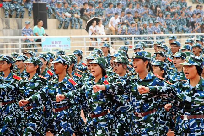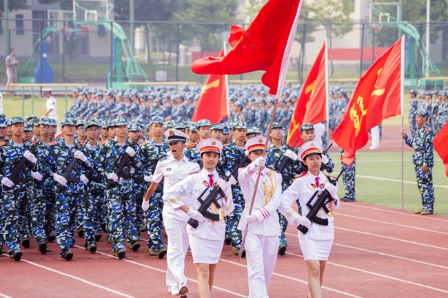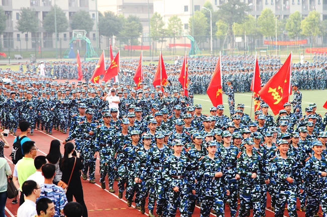 由5000多名军训学员组成的方阵,以昂首阔步的姿态迎接着初升的骄阳,一股青春的激情在田径场上空迸发。晨风中,国歌嘹亮,国旗飘扬,军威雄壮。